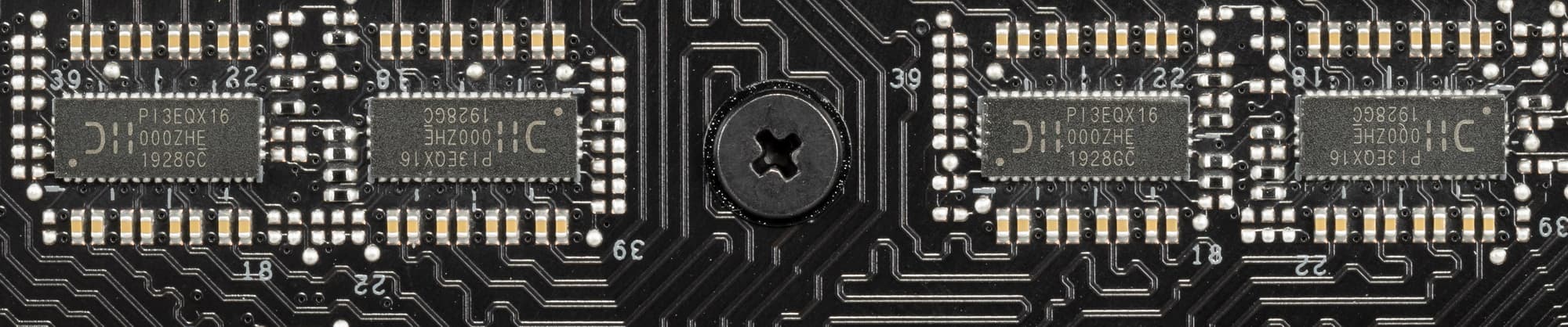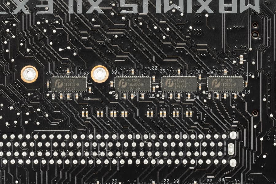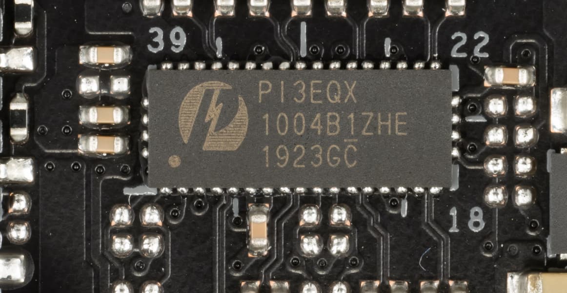 У данной платы распределение линий PCIe между слотами в случае использования более одной видеокарты или активизации DIMM.2, - достаточно витиеватое, поэтому востребованы мультиплексоры PI3DBS от Pericom.