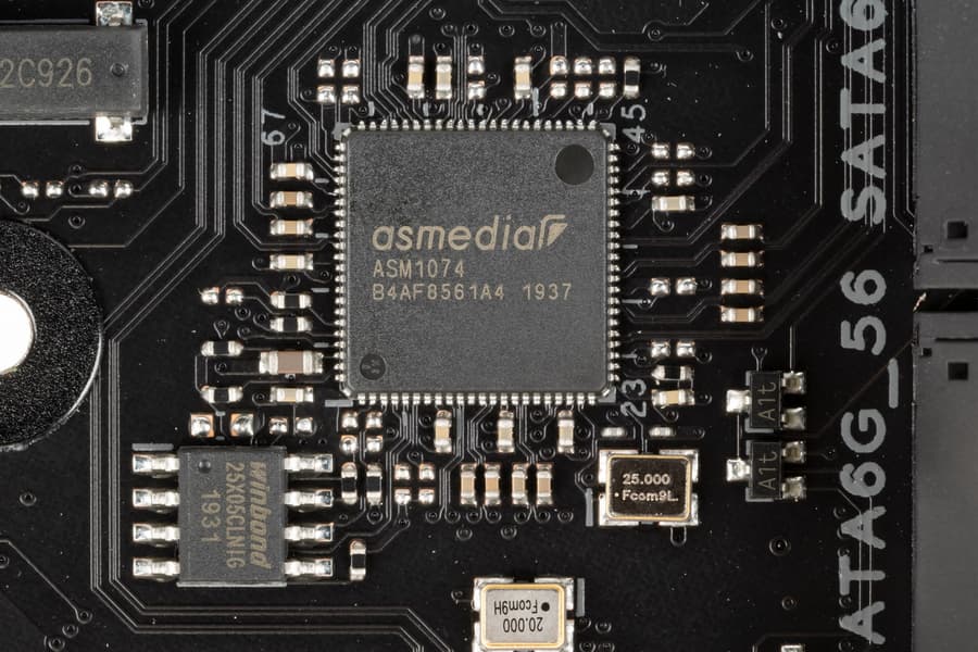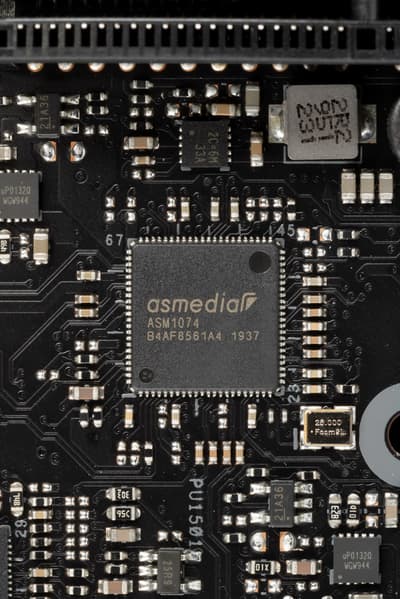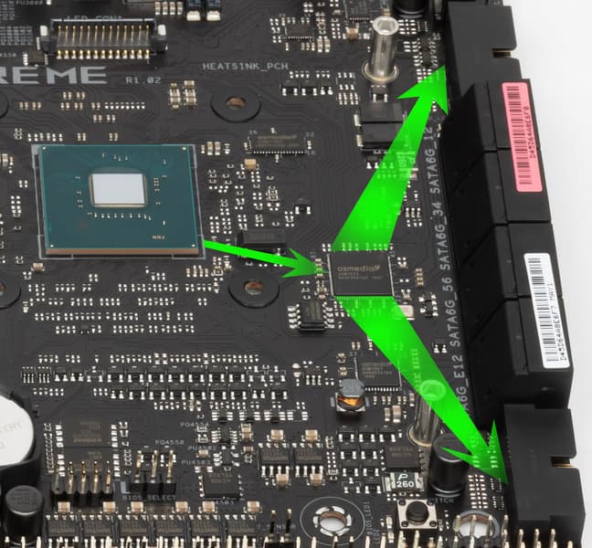 Также необходимо переключение слота PCIe x4 и портов SATA, для этих целей используется мультиплексор ASM1480 от ASMedia.