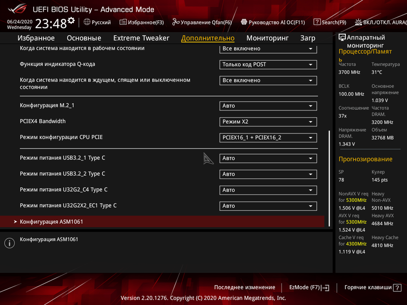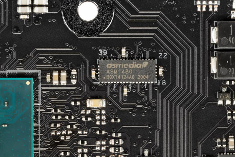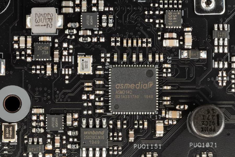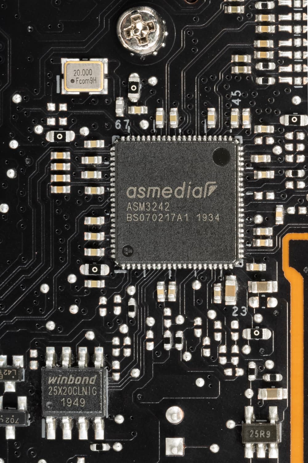 - 1 порт USB 3.2 Gen2x2 реализован через контроллер ASMedia ASM3242 (на него потрачена 1 линия PCIe) и представлен портом Type-C на задней панели;