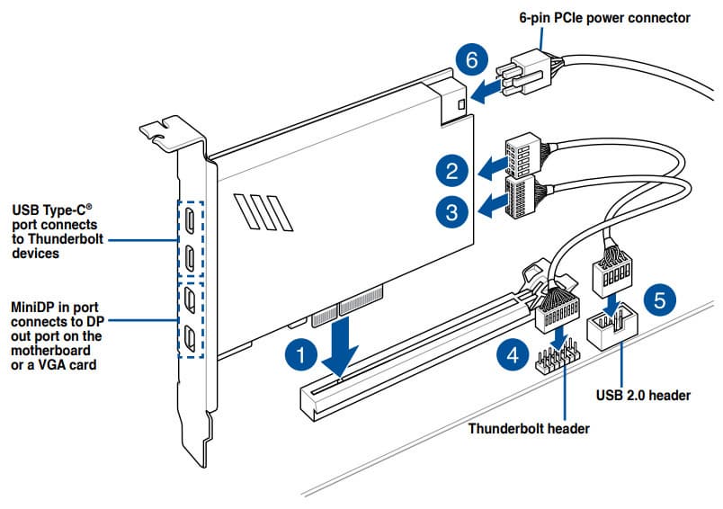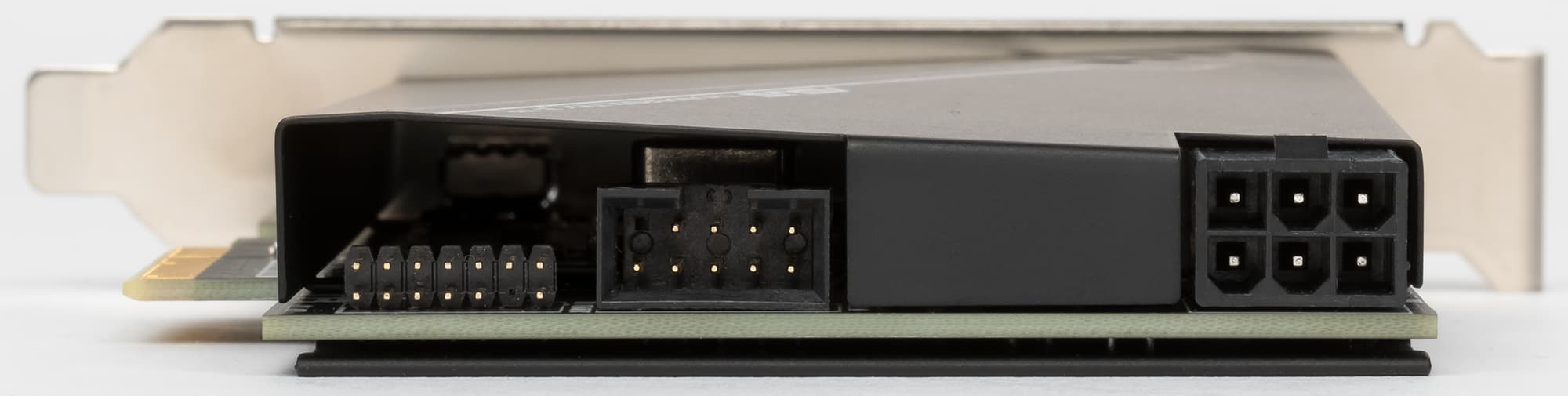 Карта требует подключения дополнительного питания (через 6-контактный разъем для питания видеокарт), а также комплектными кабелями подключается к USB 2.0 и проприетарному коннектору Thunderbolt на матплате, о котором ранее я говорил.