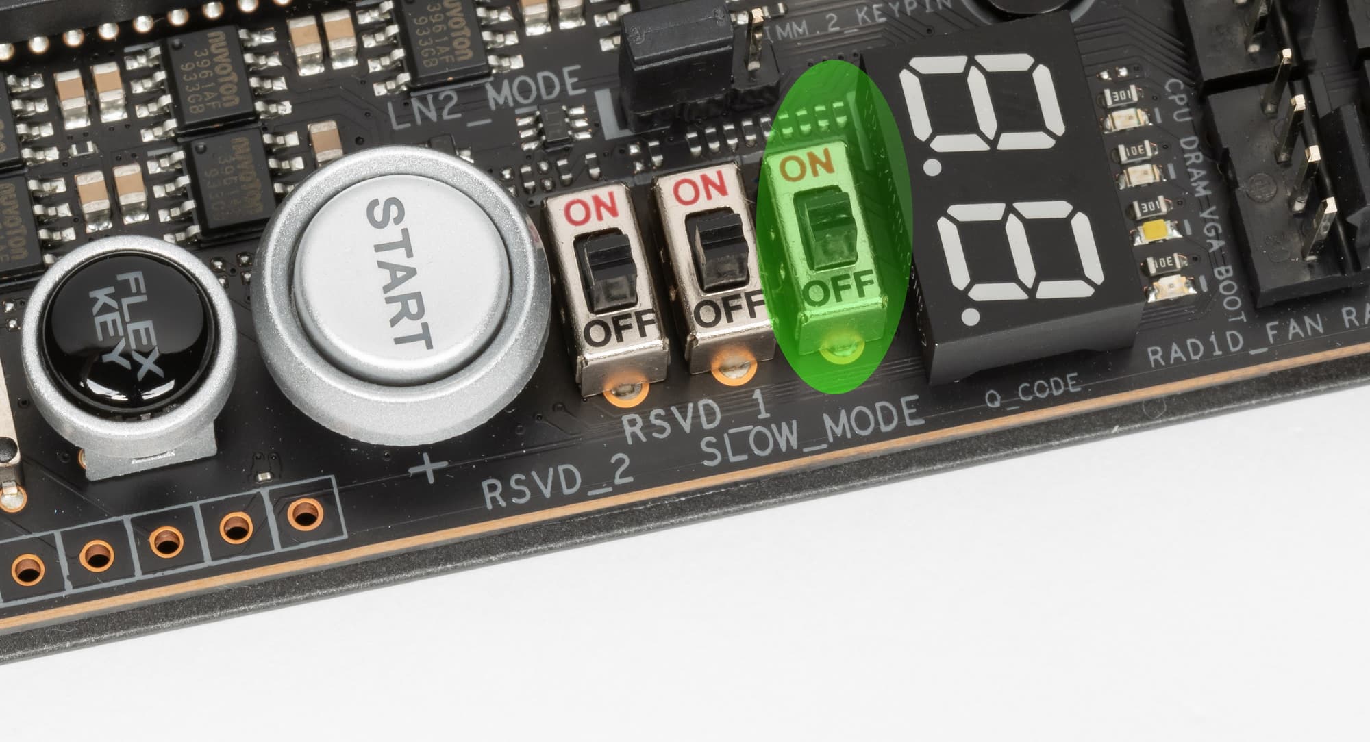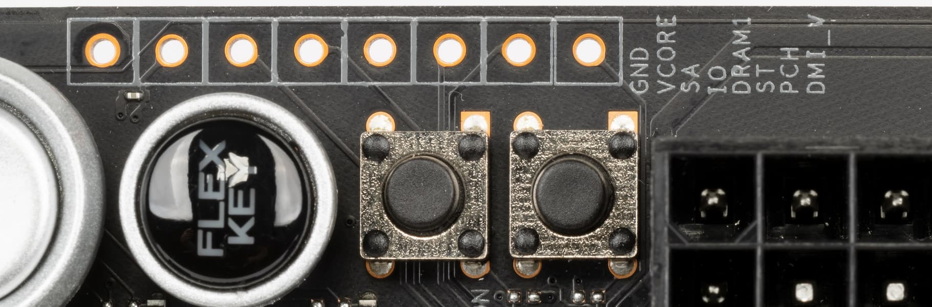 Также надо отметить и фирменные оверклокерские возможности ROG. У данной платы они есть все: и кнопка повторного запуска, и принудительная загрузка в настройки BIOS, и режим переключения LN2, и двойной BIOS, и термодатчики как на самой матплате, так и на Fan Extension card.