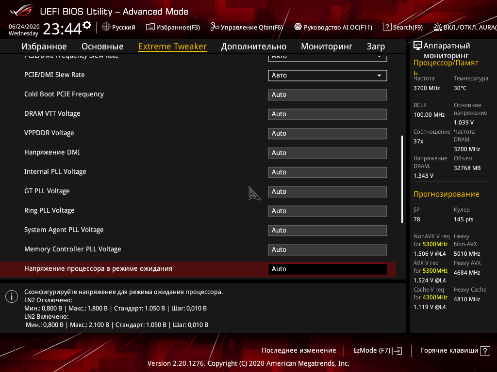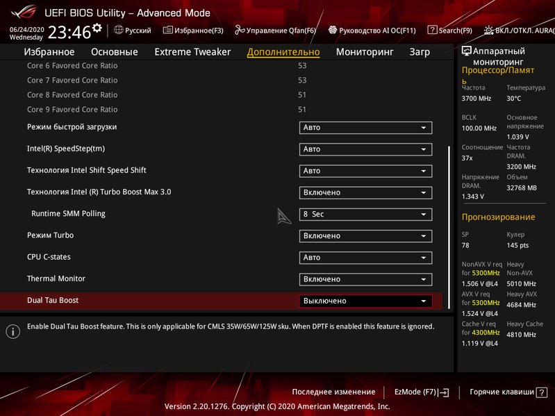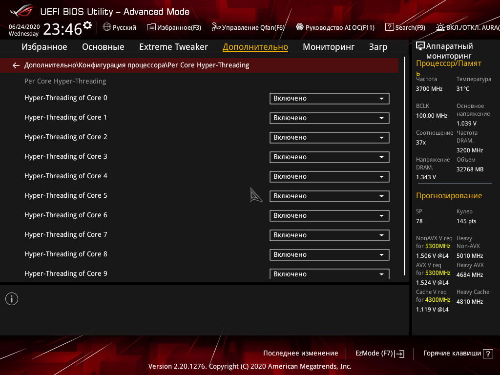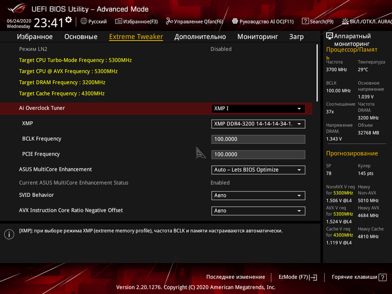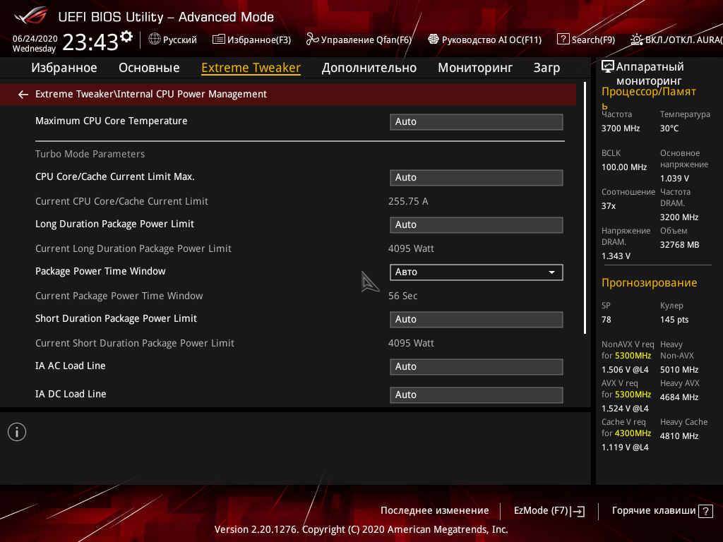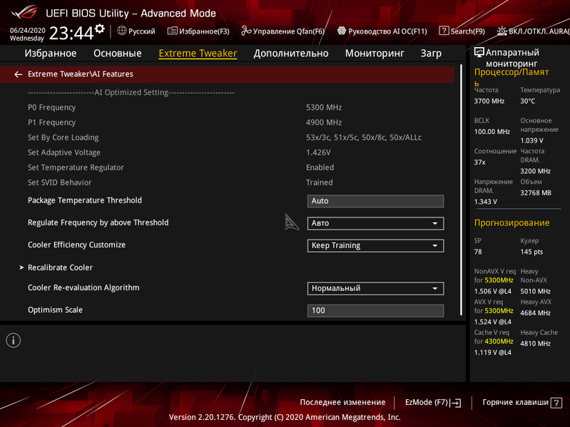 Не густо... Делаем вывод, что само по себе включение AI не включает MCE, интеллектуальный разгон пытается работать в рамках PL2. Удаляем досадный лимит (ставим MCE включенным), и получаем уже 5300 МГц по всем ядрам, однако при этом сильно повысились вольтажи (они на автомате), и образовался перегрев, а значит и троттлинг, поэтому система сбросила частоты до 5,2 ГГц.