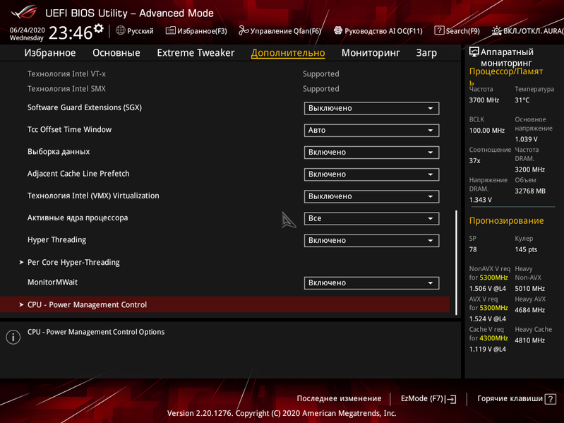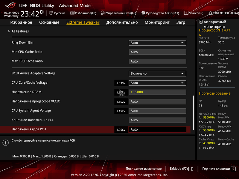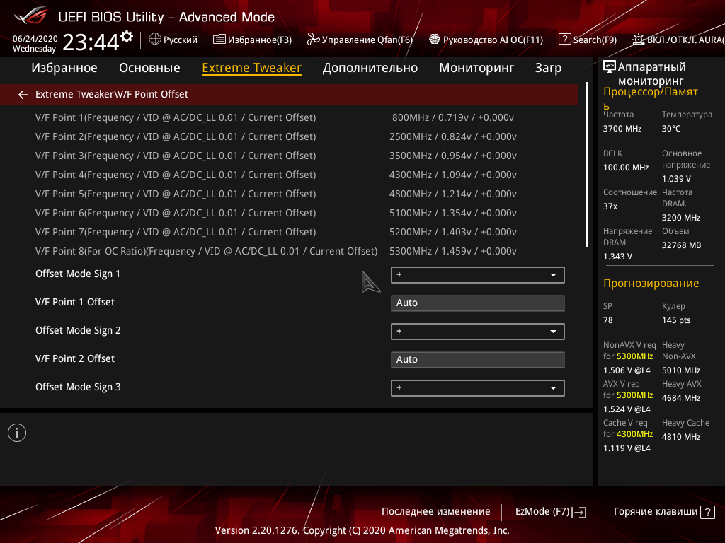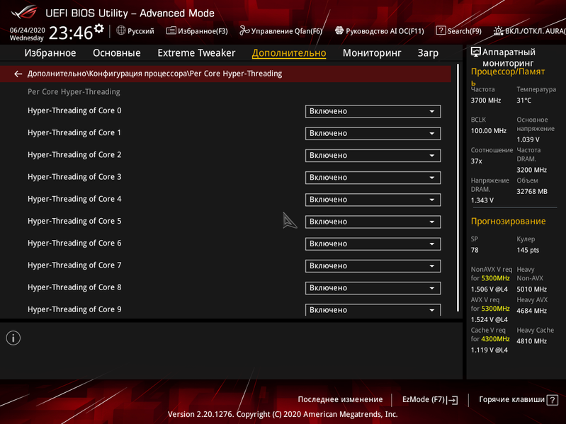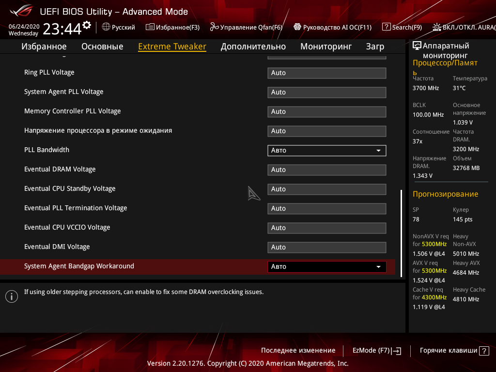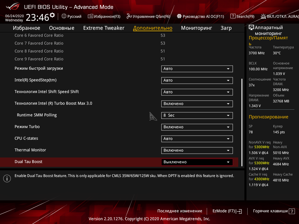 Не густо... Делаем вывод, что само по себе включение AI не включает MCE, интеллектуальный разгон пытается работать в рамках PL2. Удаляем досадный лимит (ставим MCE включенным), и получаем уже 5300 МГц по всем ядрам, однако при этом сильно повысились вольтажи (они на автомате), и образовался перегрев, а значит и троттлинг, поэтому система сбросила частоты до 5,2 ГГц.