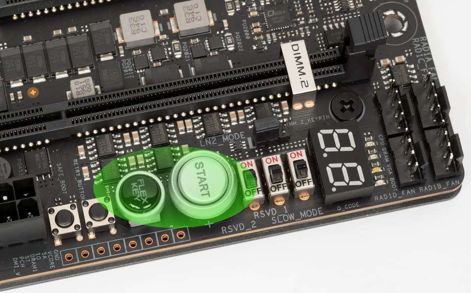 Дополнительный слот DIMM.2, служащий для подключения двух портов M.2, питается также от процессорных линий (все от тех же несчастных 16-ти). Поэтому в случае его задействования линии PCI-e будут отбираться от слотов PCI-e x16: если мы в адаптер DIMM.2 вставим один накопитель DIMM.2_1, то PCI-e x16_1 получит 8 линий, а PCI-e x16_2 — всего 4. Понятное дело, что ни о каких мультиграфических режимах типа Nvidia SLI или AMD CF речи идти не может. А если адаптер DIMM.2 займем сразу двумя накопителями DIMM.2_1 и 2_2, то PCI-e x16_2 просто будет отключен. Варианты работы DIMM.2 заложены в настройках BIOS, по умолчанию этот слот отключен.