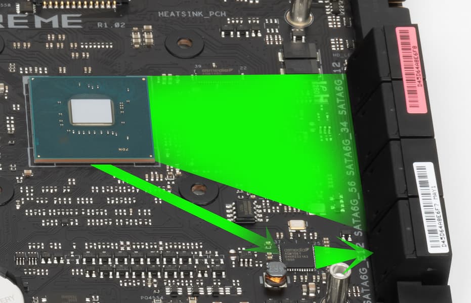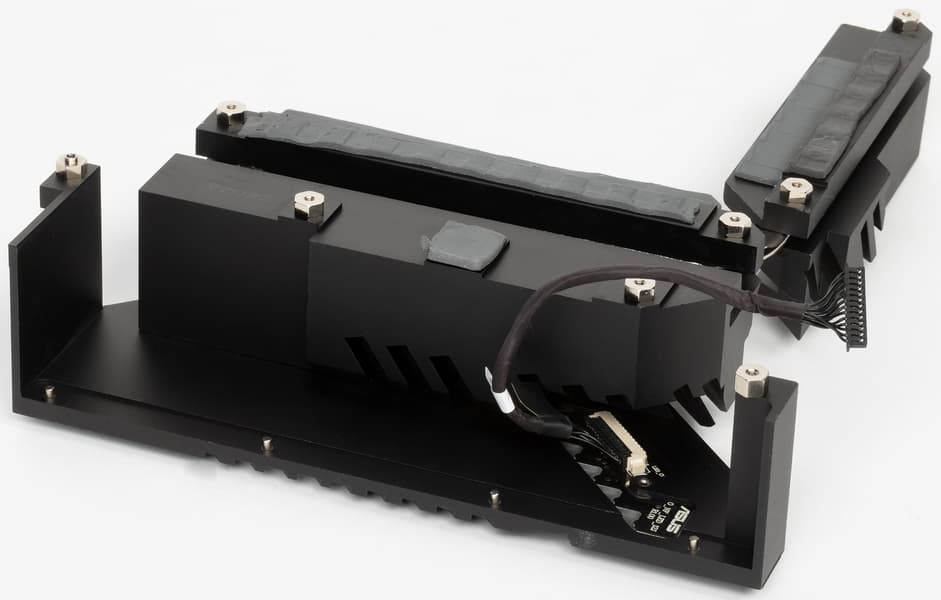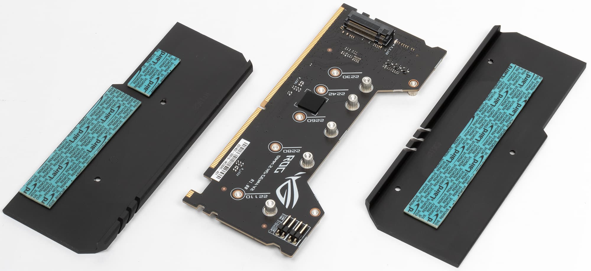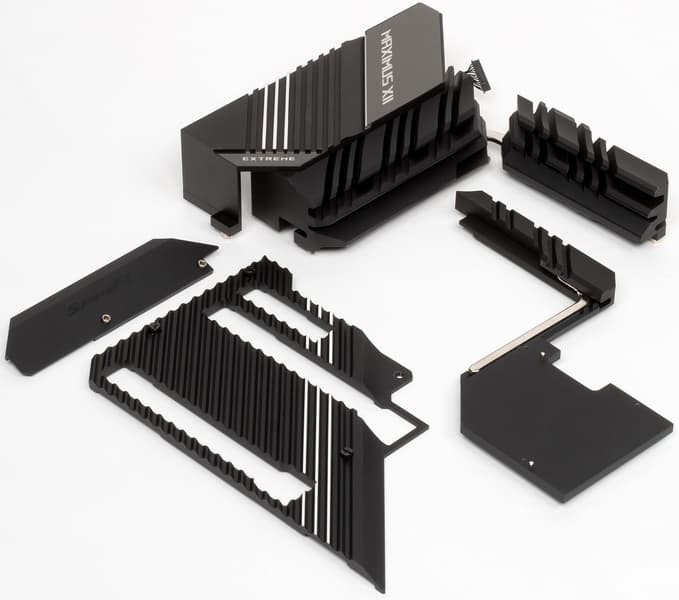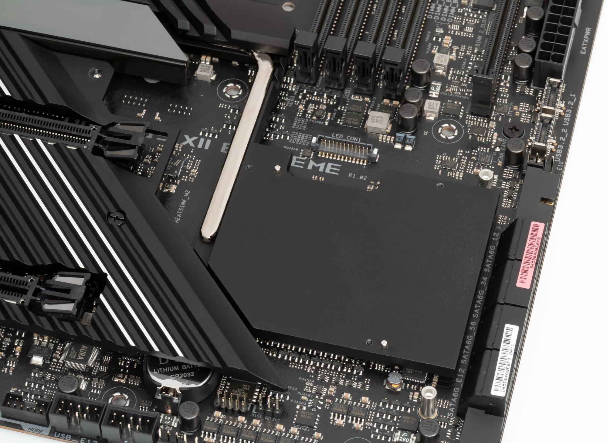 Оба M.2 слота на самой матплате имеют единый общий радиатор, который не связан с какими-то иными устройствами охлаждения на данной плате. То, что справа прижимается к нему, — это акриловая крышка радиатора чипсета.
