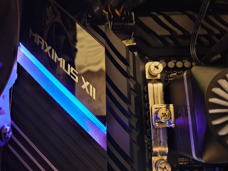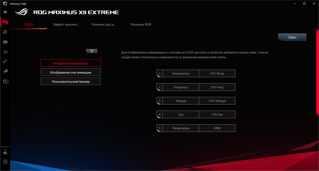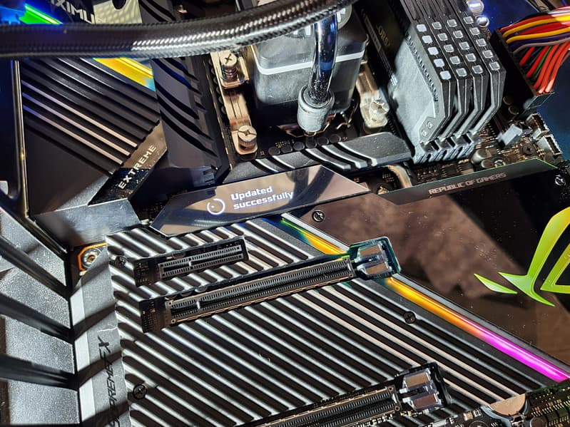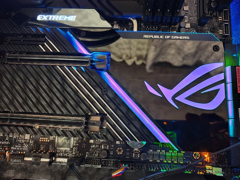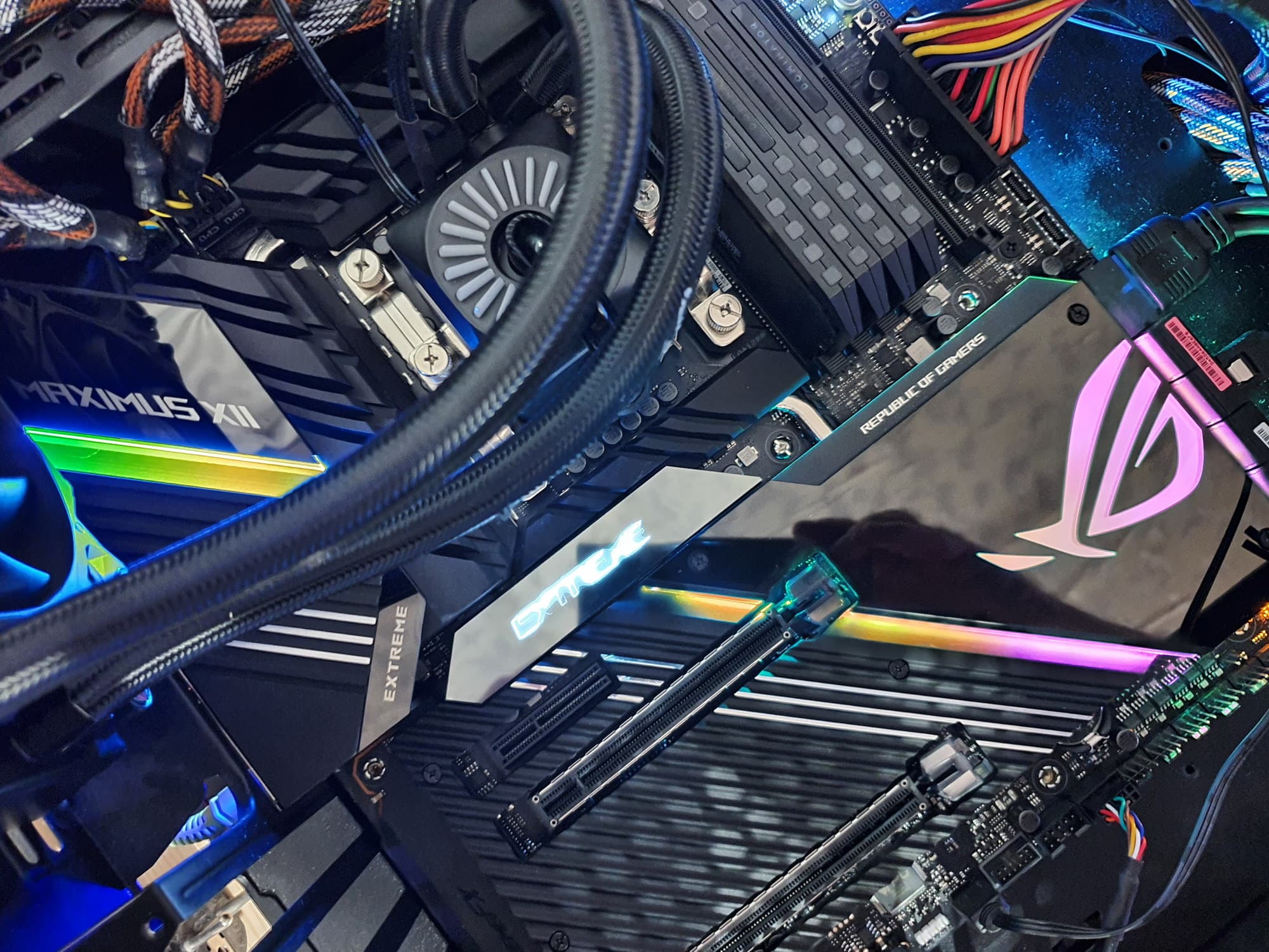Еще в плюсы ROG Maximus XII Extreme надо добавить наличие OLED-экрана, на который очень полезно выводить данные мониторинга системы. И плюс ко всему перечисленному — очень эффектная подсветка, включая широкие возможности для подключения дополнительных RGB-устройств.