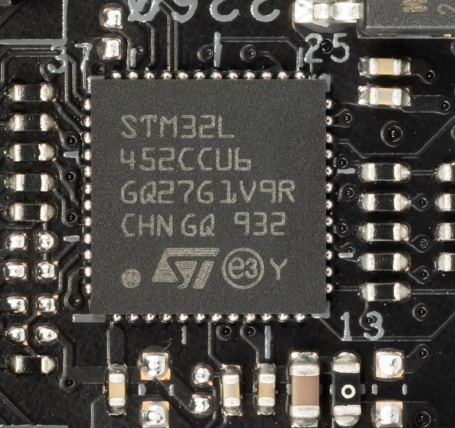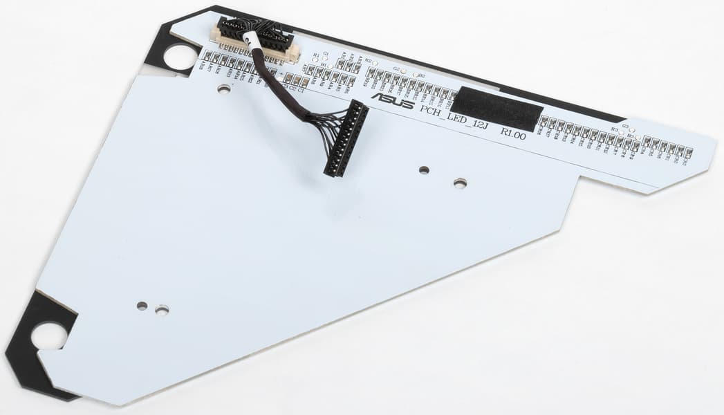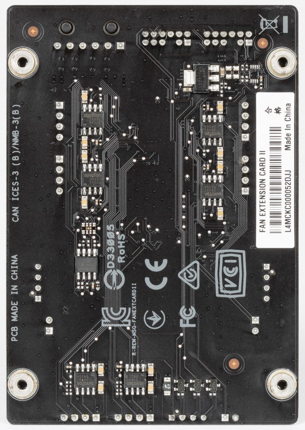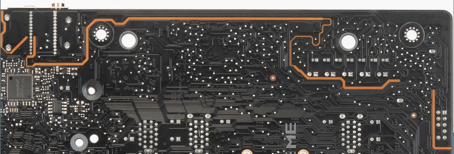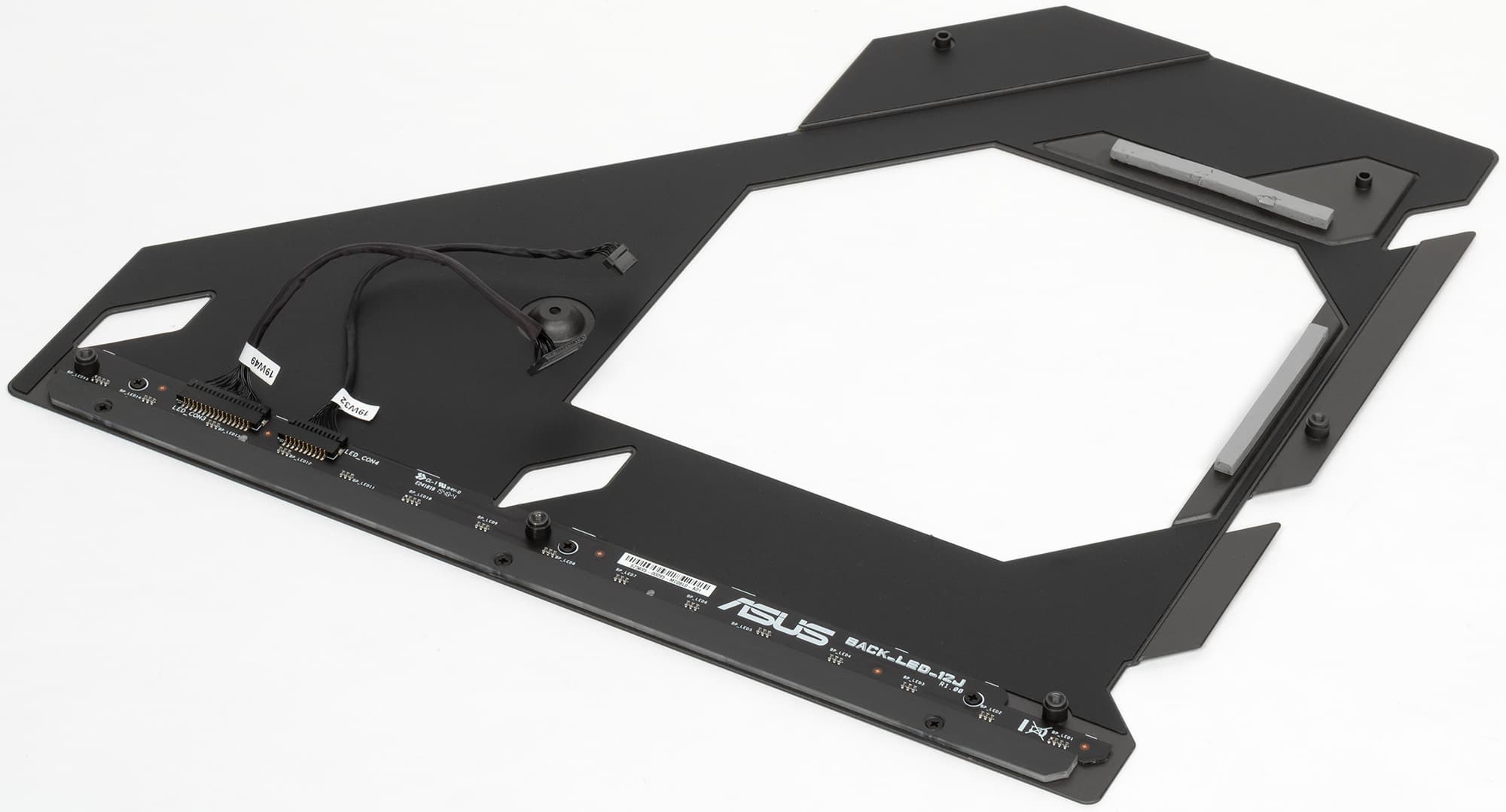 На оборотной стороне из элементов имеется ряд контроллеров, ре-драйверы и прочая мелкая логика. Обработан текстолит неплохо: во всех точках пайки острые концы срезаны. Там же установлена защитная металлическая пластина с электроизолирующим покрытием. Пластина также несет на себе боковую подсветку, которая эффектно смотрится «из-под» платы. Сама печатная плата имеет 8 слоев и выполнена безупречно.