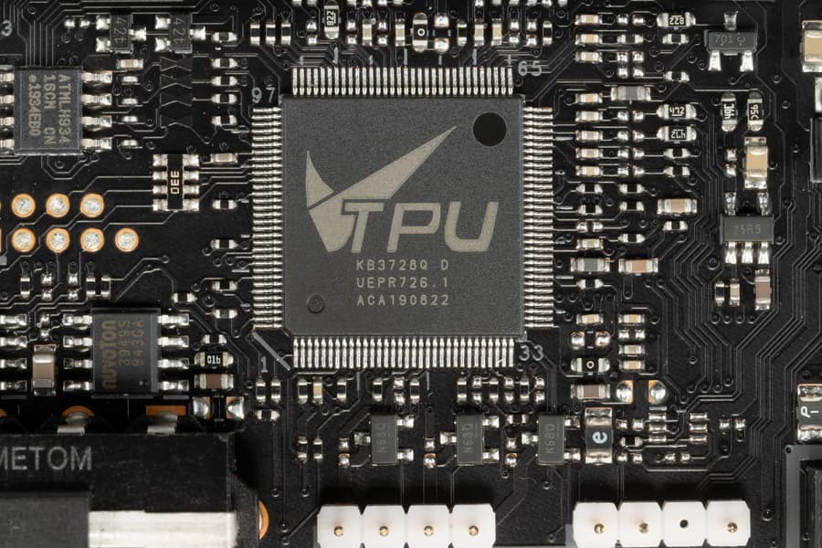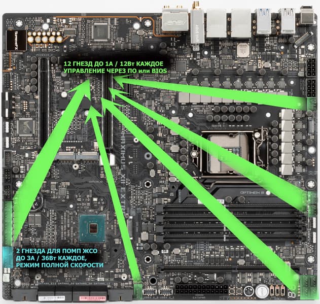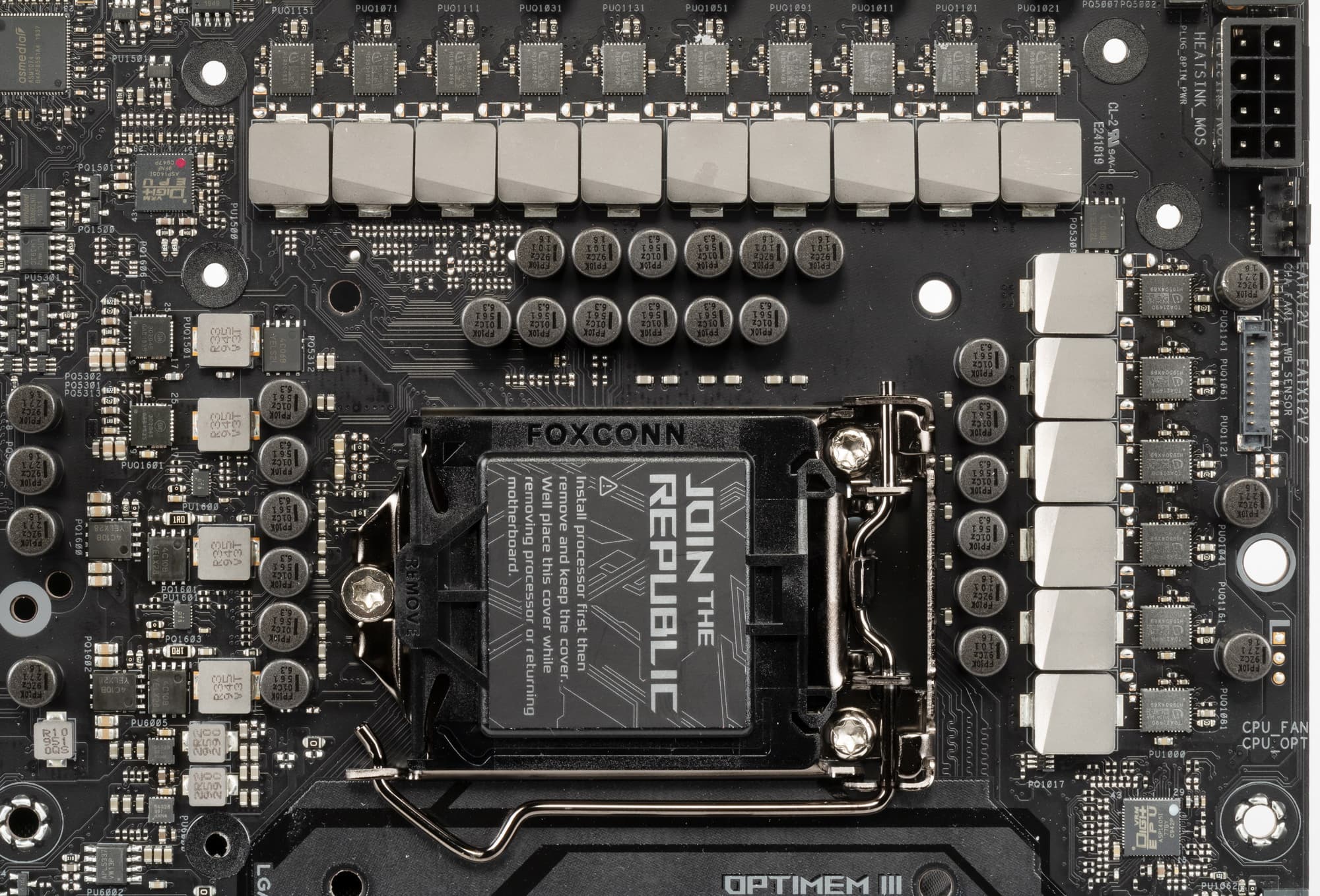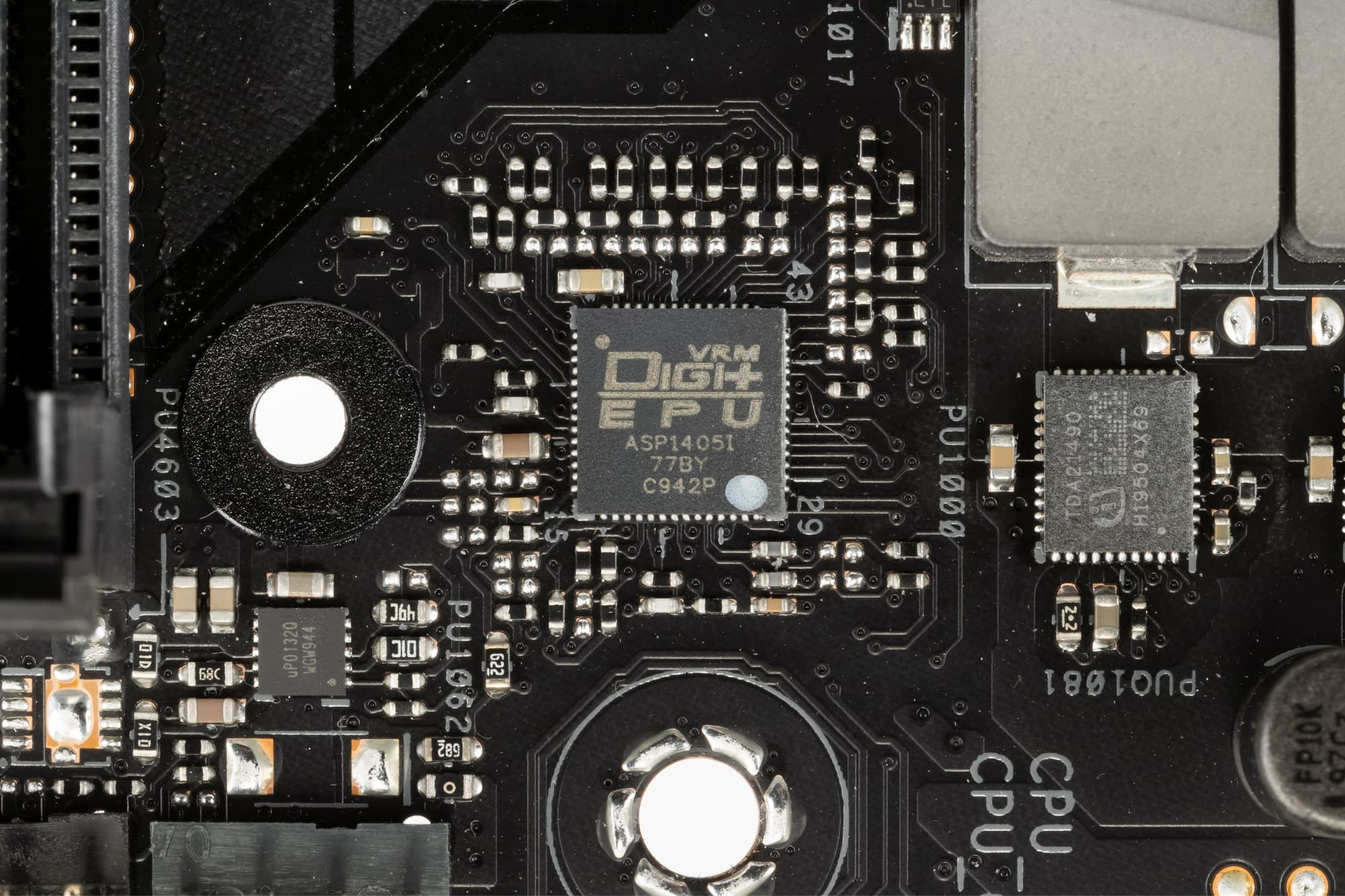Подход Asus/ROG к организации питания в принципе хорош (хоть и не является буквально честным, за что ратуют некоторые пользователи). Ведь удвоителей и тупо поделенных ими фаз нет, а имеется контроллер TPU, который совместно с рядом иных распределяет фазы (ему помогают в этом «разбросанные» по плате переключатели от uPI Semiconduictor