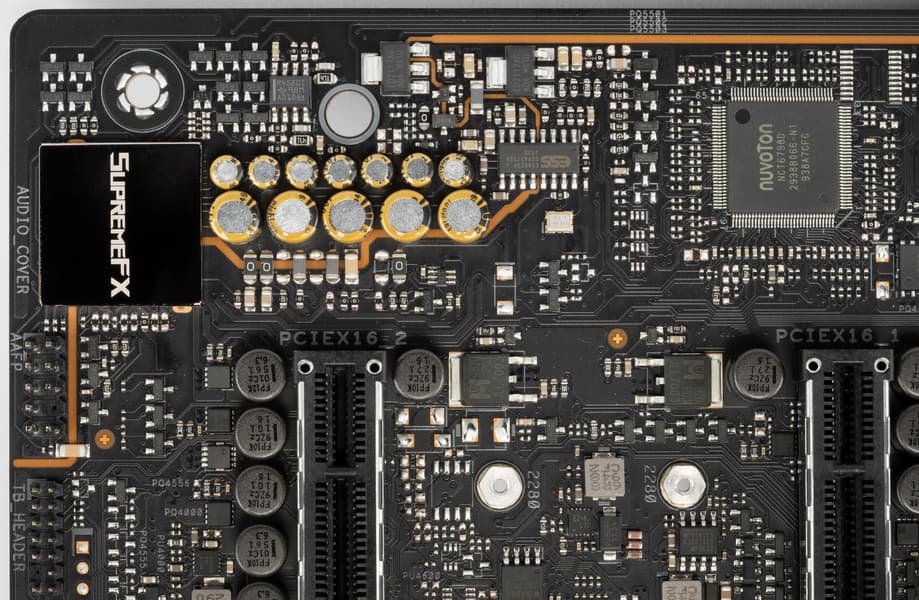 Данная аудиоподсистема несколько отличается от традиционных в целом, но типична для продуктов Asus. Как и во всех современных материнских платах звуком заведует аудиокодек Realtek ALC1220 (он и в данном случае есть — просто Asus всегда его во что-то перемаркировывает, в данном случае в SupremeFX). Он обеспечивает вывод звука по схемам до 7.1.
