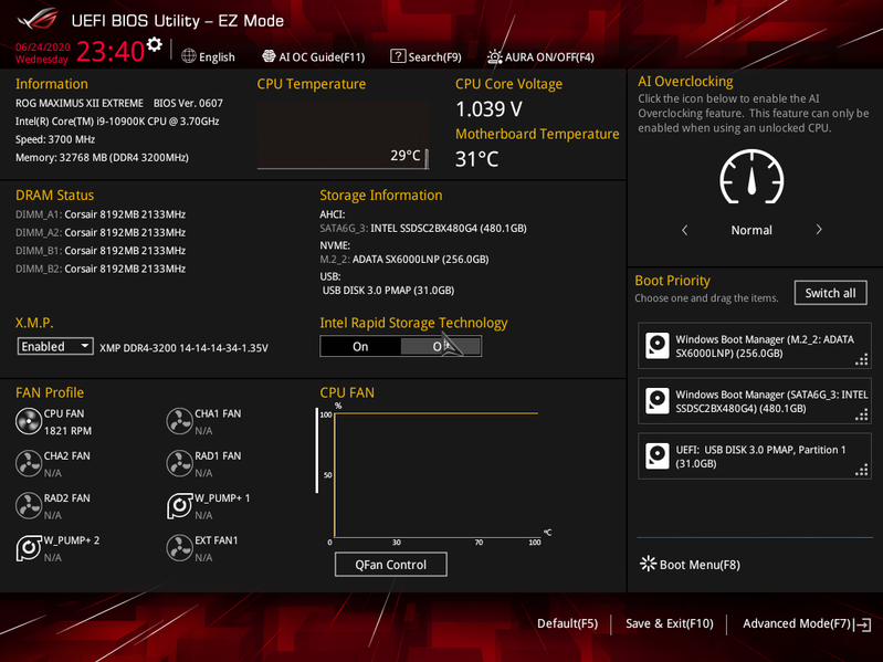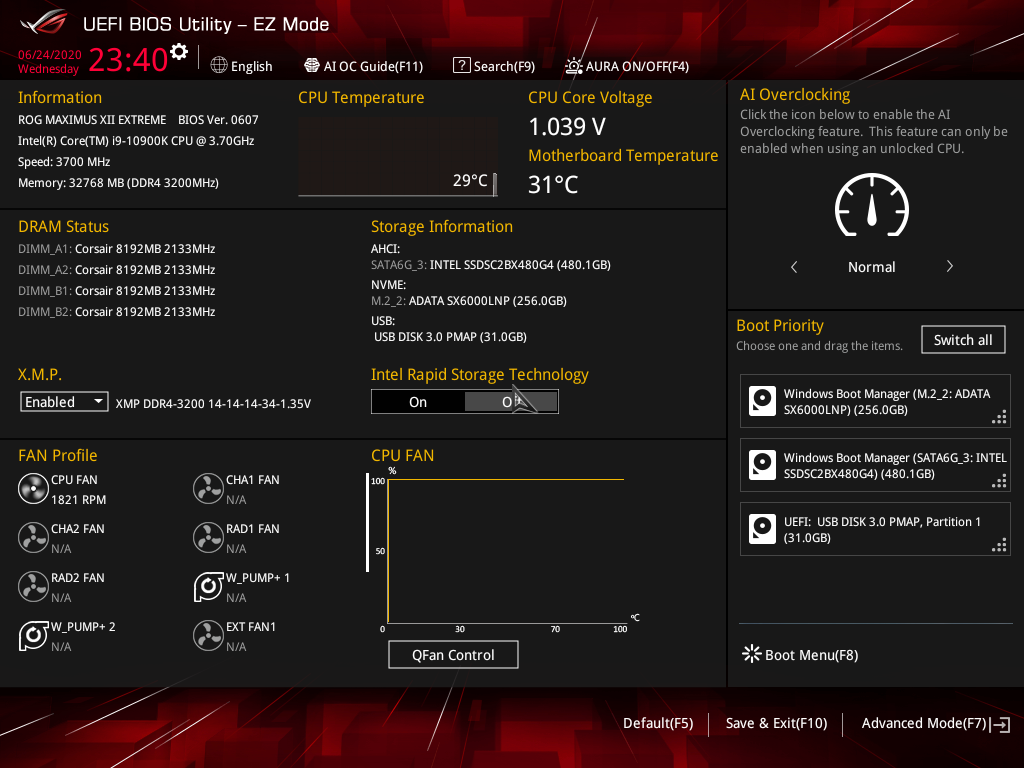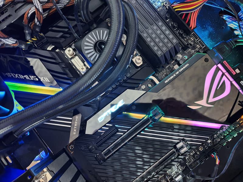 Функциональность у ROG Maximus XII Extreme высочайшая. Мы имеем 22 порта USB разных видов (включая 6 самых быстрых на сегодня), 3 слота PCIe х16 (из которых первые два получают 16 линий PCIe от процессора с возможностью создать Nvidia SLI или AMD CrossFire), слот PCIe x4 для карт расширения, 2 слота M.2 на самой плате плюс 2 слота M.2 через адаптер DIMM.2, 8 портов SATA. Система питания процессора включает 16 фаз для ядра и способна обеспечить работу любых совместимых процессоров под серьезным разгоном. Плата имеет мощные радиаторы на силовых элементах системы питания, усиленные комплектным вентилятором, 14 разъемов для подключения вентиляторов и помп (плюс еще 6 на Fan Extension Card), также радиаторами оснащены все накопители в слотах M.2. Дополняют картину два скоростных проводных сетевых контроллера (2,5-гигабитный и 10-гигабитный), а также беспроводной контроллер, реализующий Wi-Fi 802.11ac и Bluetooth 5.0.