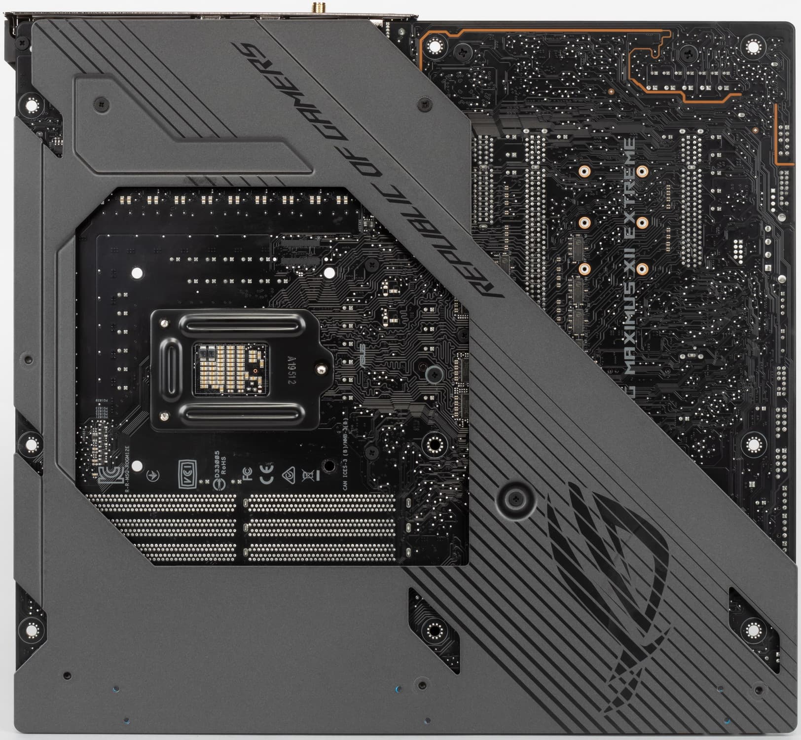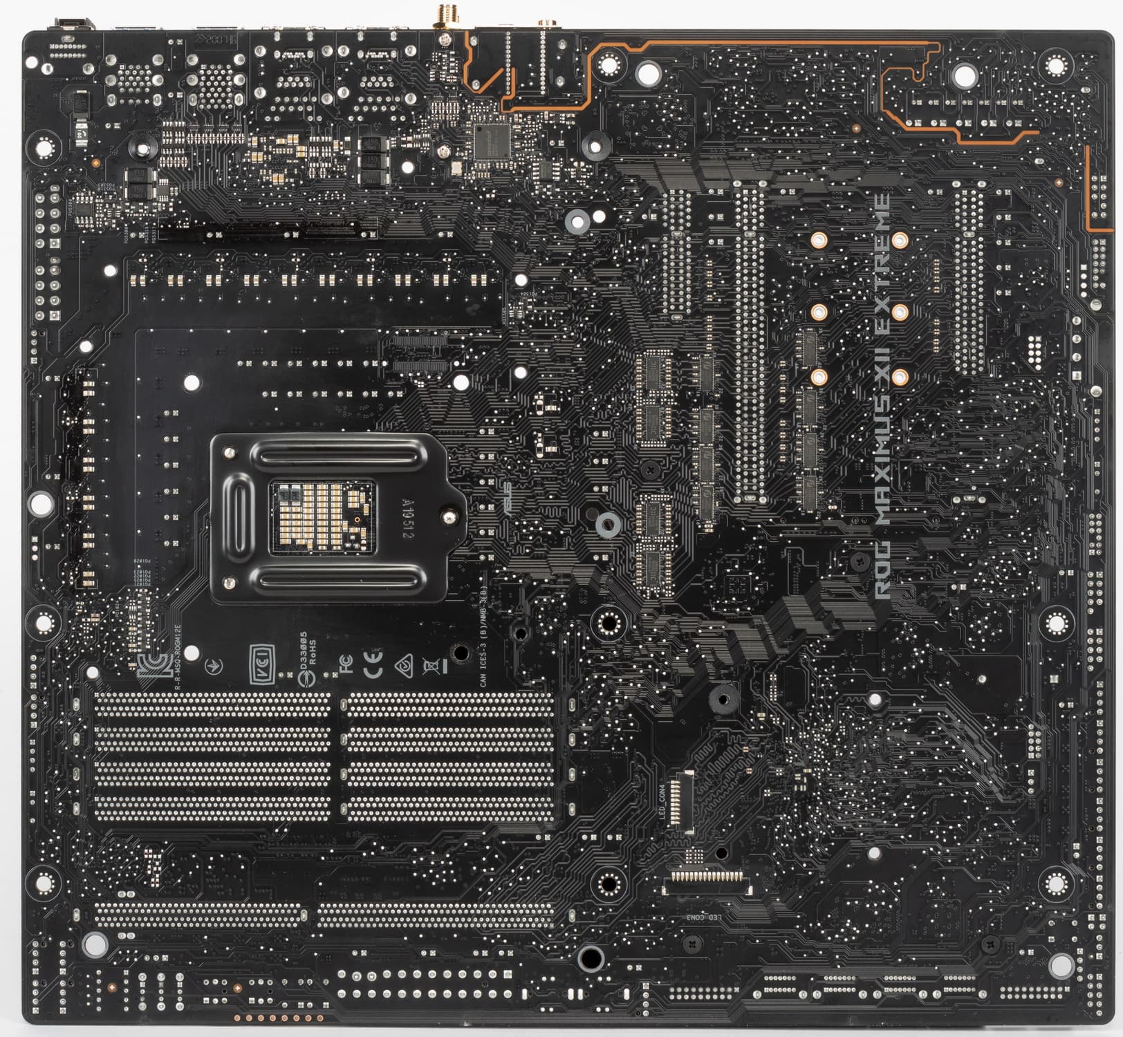 Форм-фактор ATX имеет размеры до 305×244 мм, а E-ATX — до 305×330 мм. Материнская плата ROG Maximus XII Extreme имеет размеры 305×277 мм, поэтому выполнена в форм-факторе E-ATX, и на ней имеются 9 монтажных отверстий для установки в корпус.