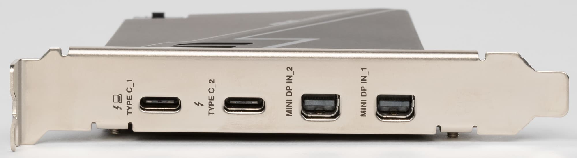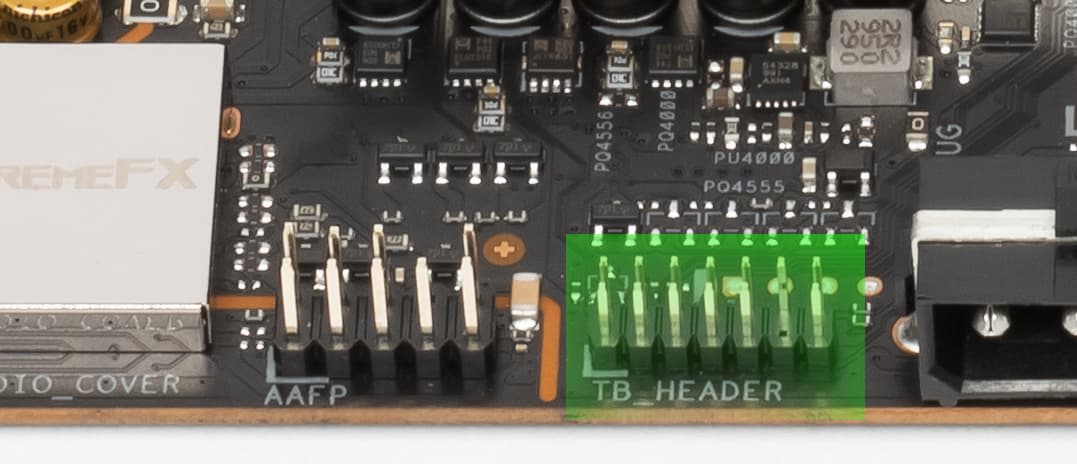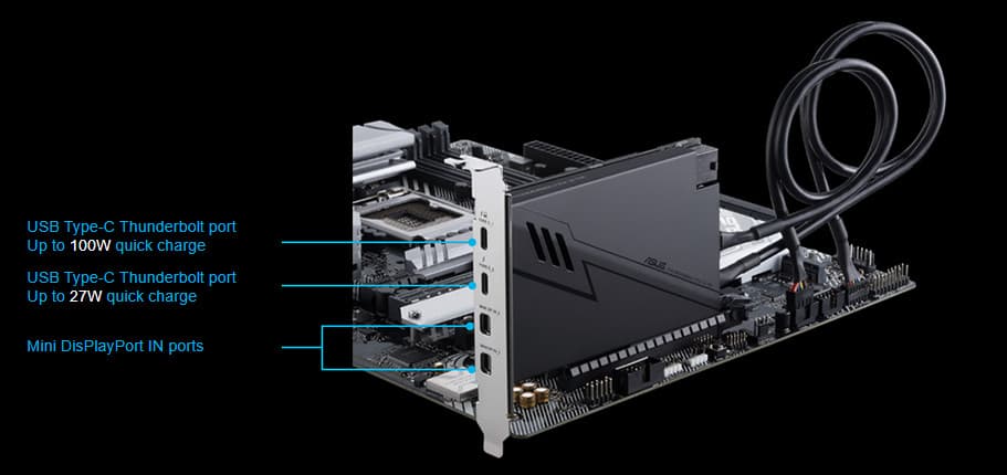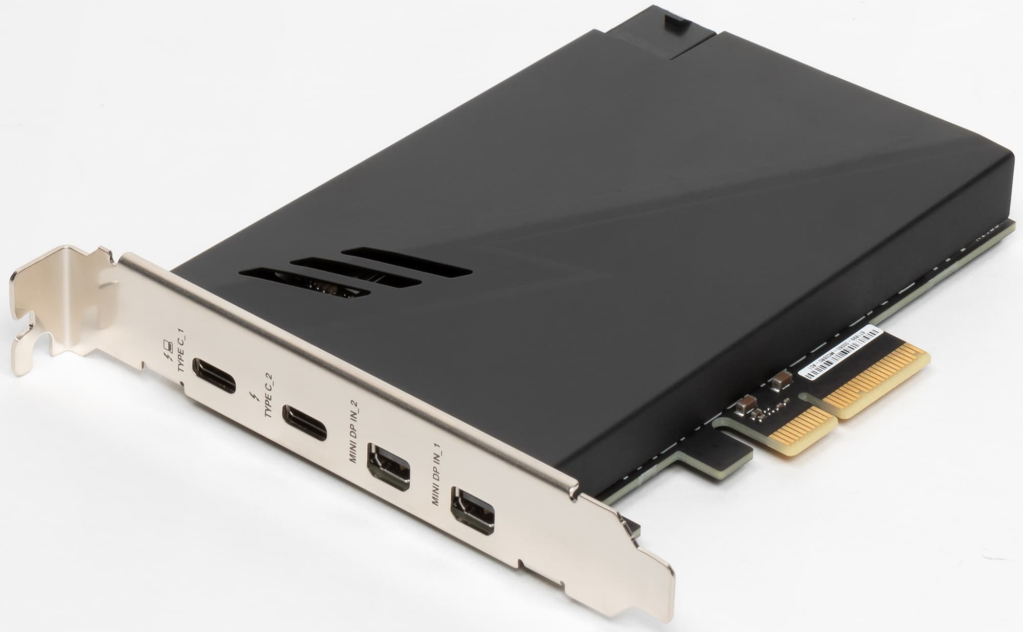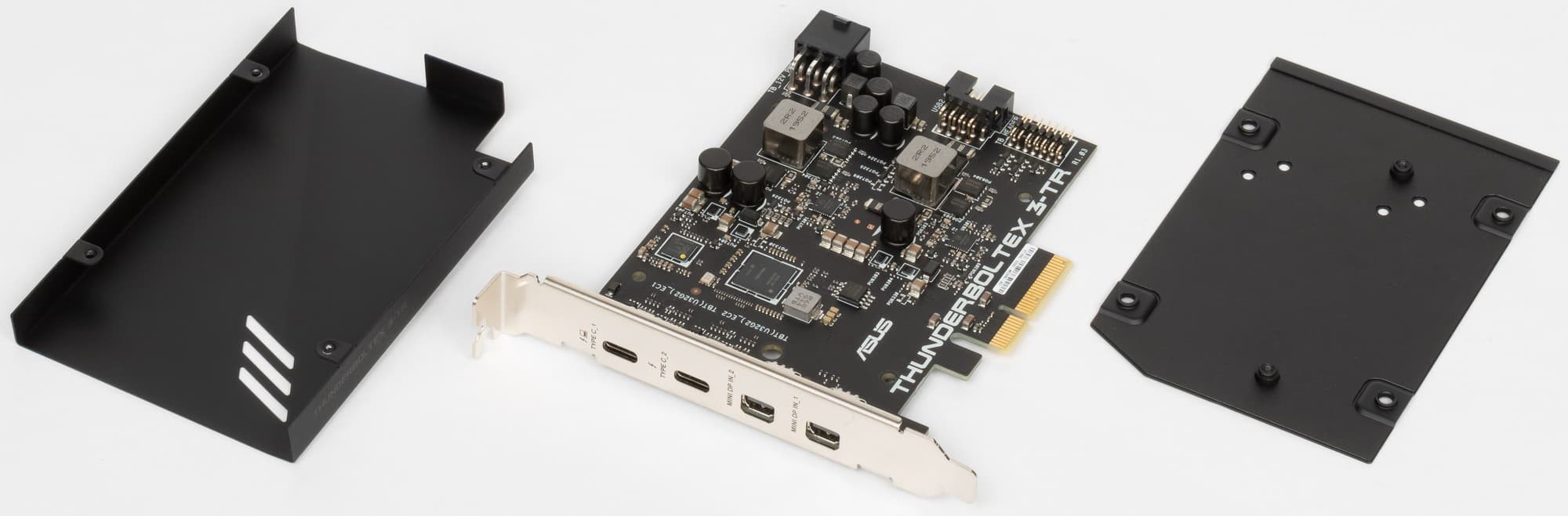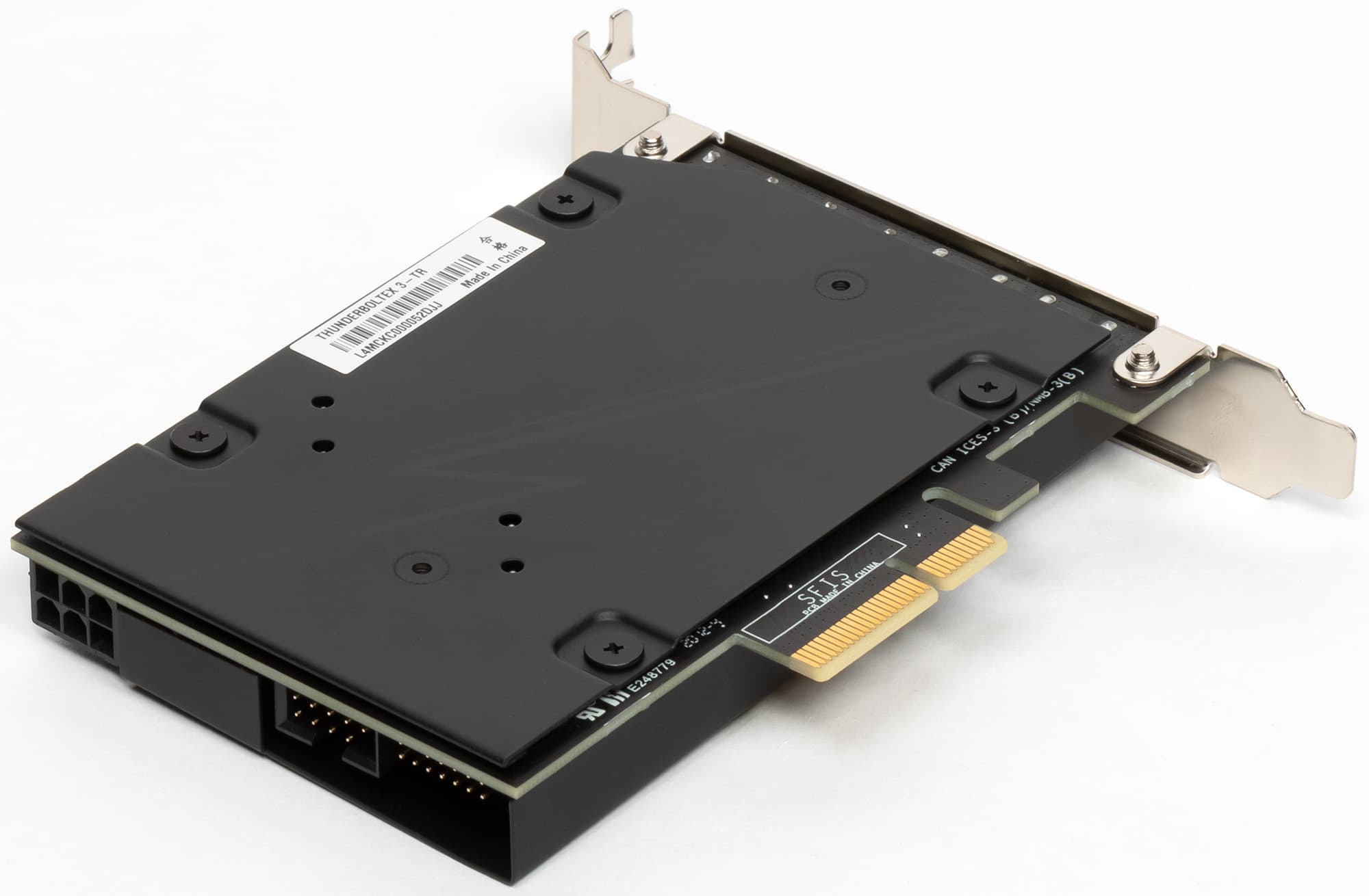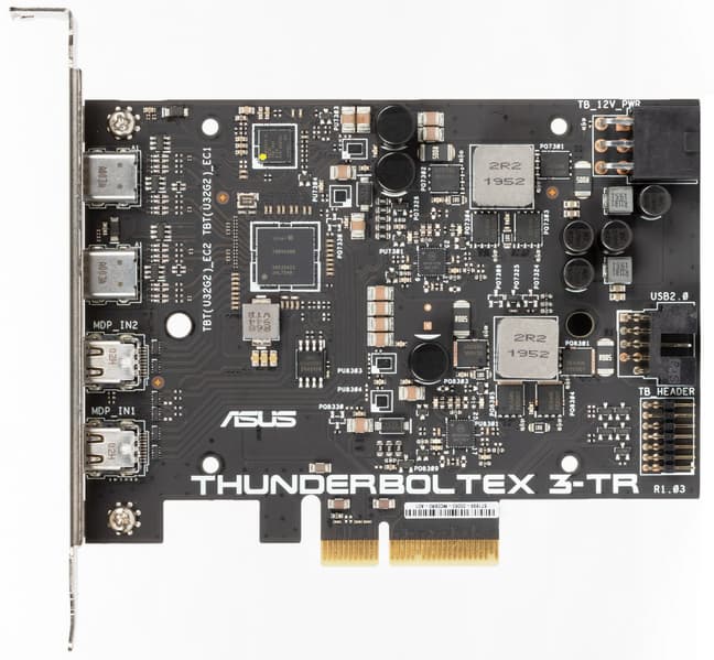Собственно продолжение темы с портами займет карта расширения Thunderbolt 3-TR Expansion Card, поставляемая с материнской платой. Это по сути дополнительный контроллер Intel Thunderbolt 3, но не распаянный на самой материнке, а в виде отдельной карты.