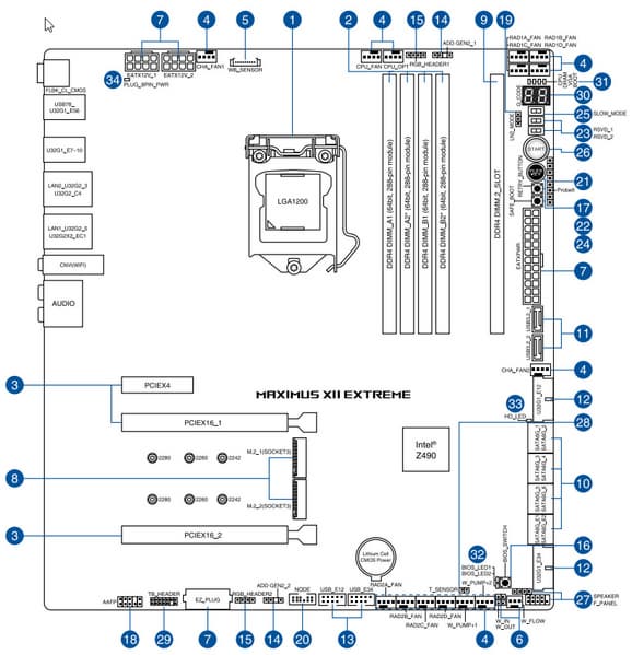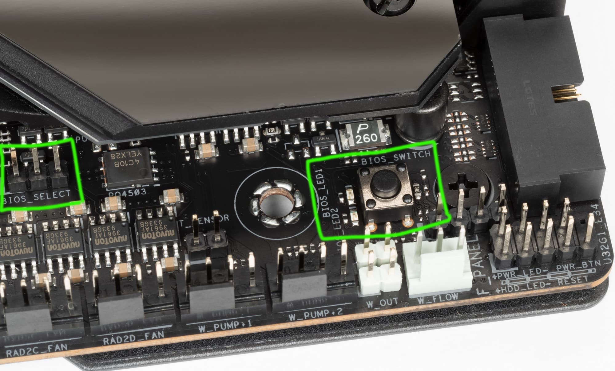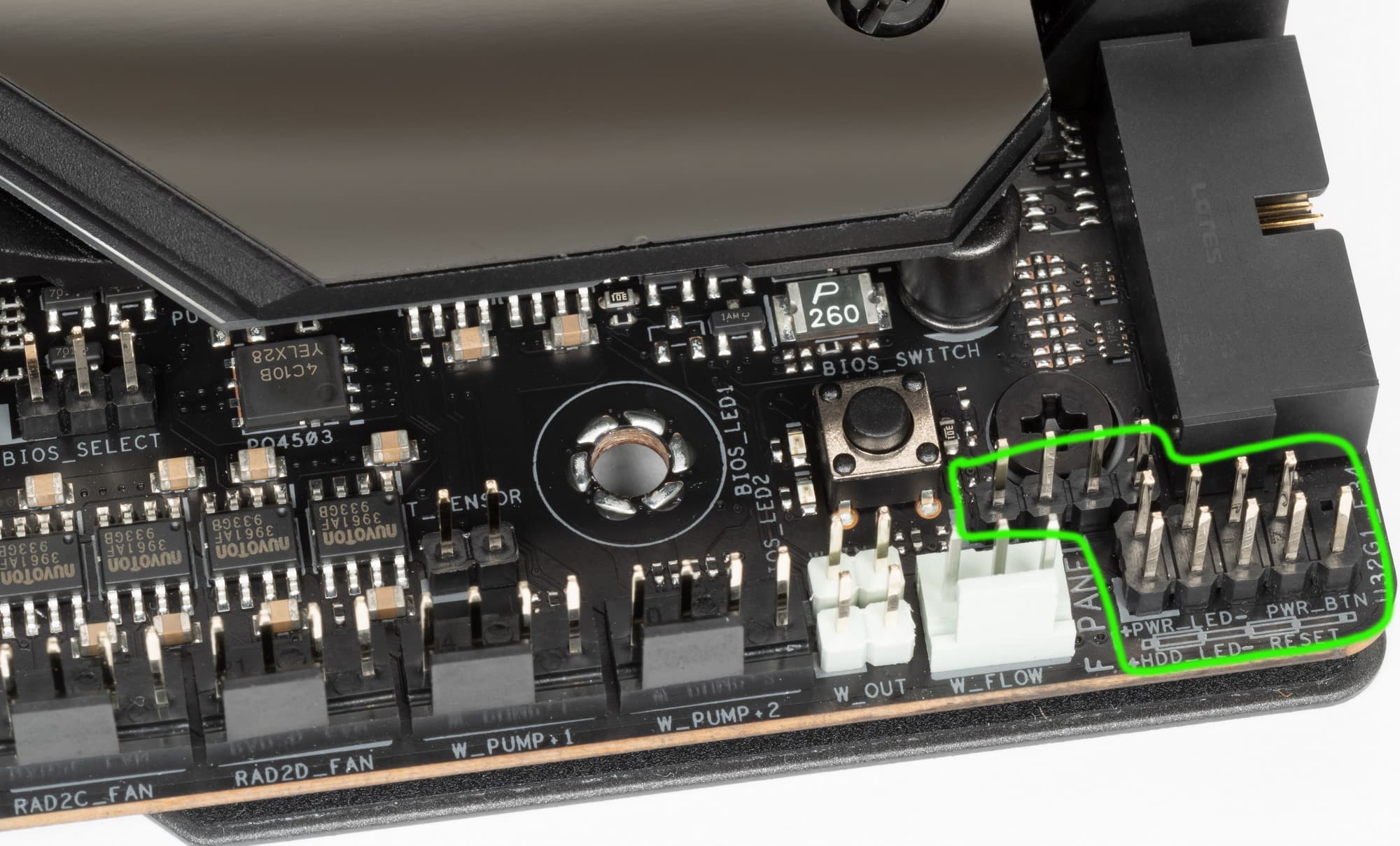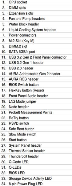 | Прочие внутренние элементы | 24-контактный разъем питания ATX 2 8-контактных разъема питания EPS12V 1 4-контактный разъем питания «Molex» 1 слот M.2 (E-key), занят адаптером беспроводных сетей 2 разъема для подключения портов USB 3.2 Gen2 Type-C 2 разъема для подключения 4 портов USB 3.2 Gen1 2 разъема для подключения 4 портов USB 2.0 14 разъемов для подключения 4-контактных вентиляторов и помп ЖСО 2 разъема для подключения неадресуемой RGB-ленты 2 разъема для подключения адресуемой ARGB-ленты 1 разъем аудио для передней панели корпуса 1 разъем Thunderbolt 1 разъем для термодатчика 2 разъема для подключения управления с передней панели корпуса 1 разъем Node 1 разъем включения режима LN2 1 переключатель Slow_Mode 1 кнопка Retry 1 кнопка Safe_Boot 1 кнопка переключения BIOS 1 кнопка включения питания Power 1 кнопка перезагрузки FlexKey (по умолчанию Reset) |