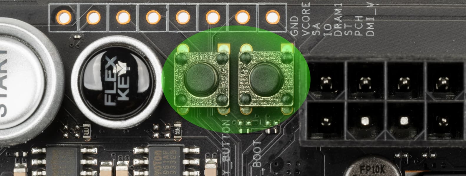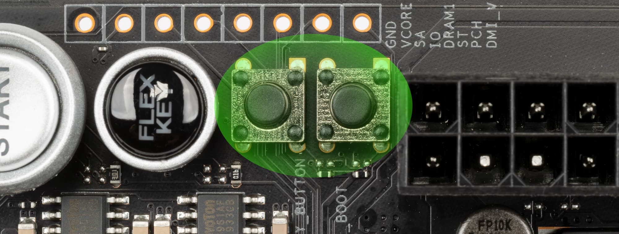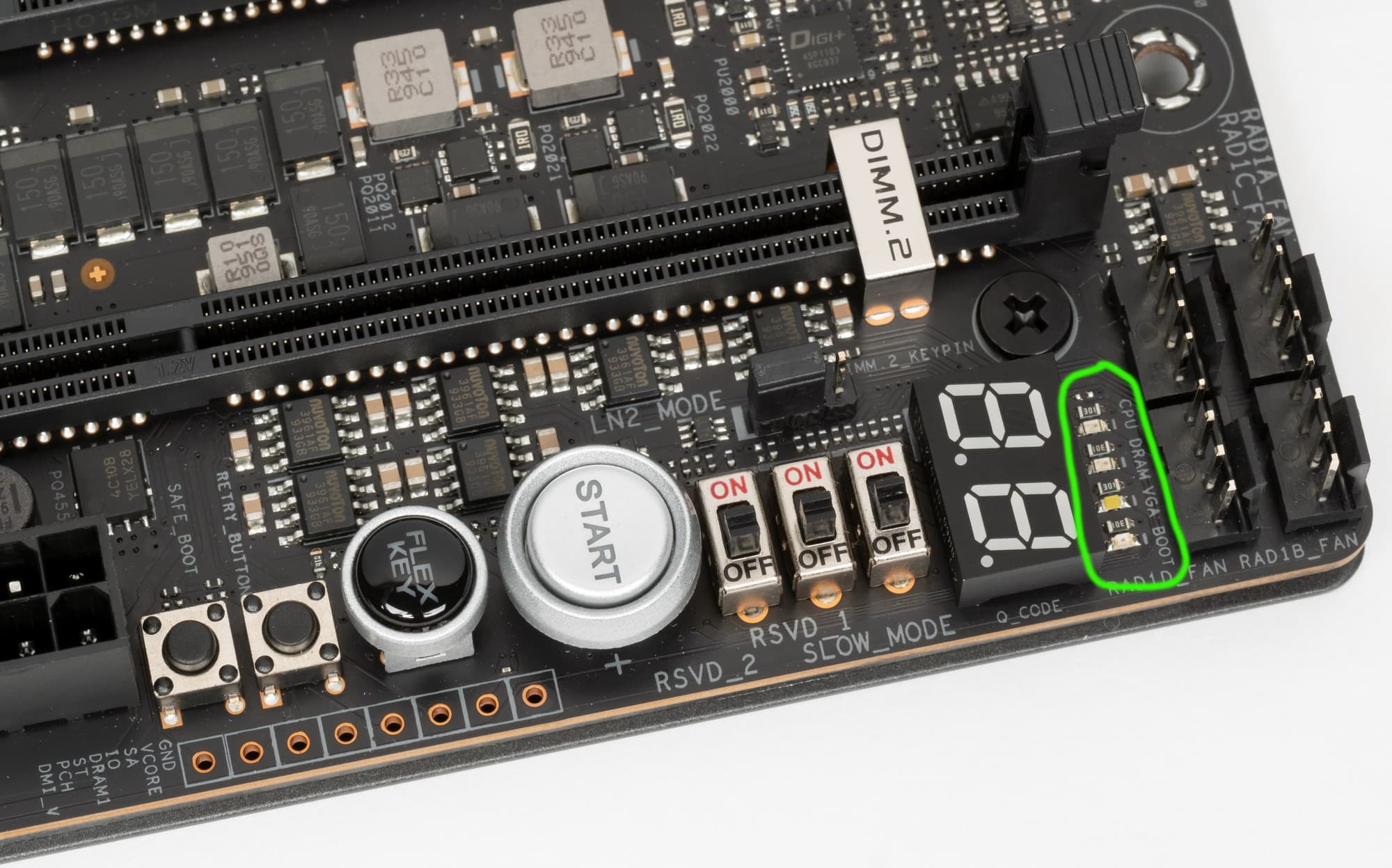 | Прочие внутренние элементы | 24-контактный разъем питания ATX 2 8-контактных разъема питания EPS12V 1 4-контактный разъем питания «Molex» 1 слот M.2 (E-key), занят адаптером беспроводных сетей 2 разъема для подключения портов USB 3.2 Gen2 Type-C 2 разъема для подключения 4 портов USB 3.2 Gen1 2 разъема для подключения 4 портов USB 2.0 14 разъемов для подключения 4-контактных вентиляторов и помп ЖСО 2 разъема для подключения неадресуемой RGB-ленты 2 разъема для подключения адресуемой ARGB-ленты 1 разъем аудио для передней панели корпуса 1 разъем Thunderbolt 1 разъем для термодатчика 2 разъема для подключения управления с передней панели корпуса 1 разъем Node 1 разъем включения режима LN2 1 переключатель Slow_Mode 1 кнопка Retry 1 кнопка Safe_Boot 1 кнопка переключения BIOS 1 кнопка включения питания Power 1 кнопка перезагрузки FlexKey (по умолчанию Reset) |