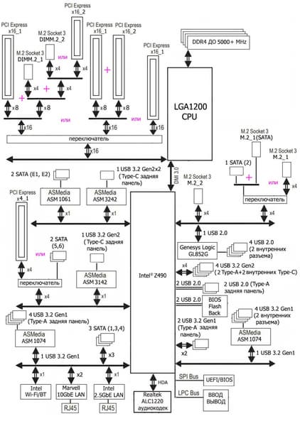 Процессоры Intel Core 10-го поколения (совместимые с сокетом LGA1200 и поддерживаемые Z490) имеют 16 линий ввода-вывода (включая PCIe 3.0), не имеют USB и SATA портов. При этом взаимодействие с Z490 идет по особому каналу Digital Media Interface 3.0 (DMI 3.0), и линии PCIe на это не расходуются. Все PCIe линии процессора идут на слоты расширения PCIe. Serial Peripheral Interface (SPI) используется для взаимодействия с системой UEFI/BIOS, а шина Low Pin Count (LPC) — для связи с устройствами ввода/вывода, не требующими высокой пропускной способности (контроллерами вентиляторов, TPM, старой периферии).
