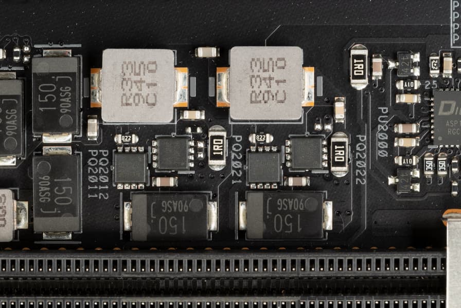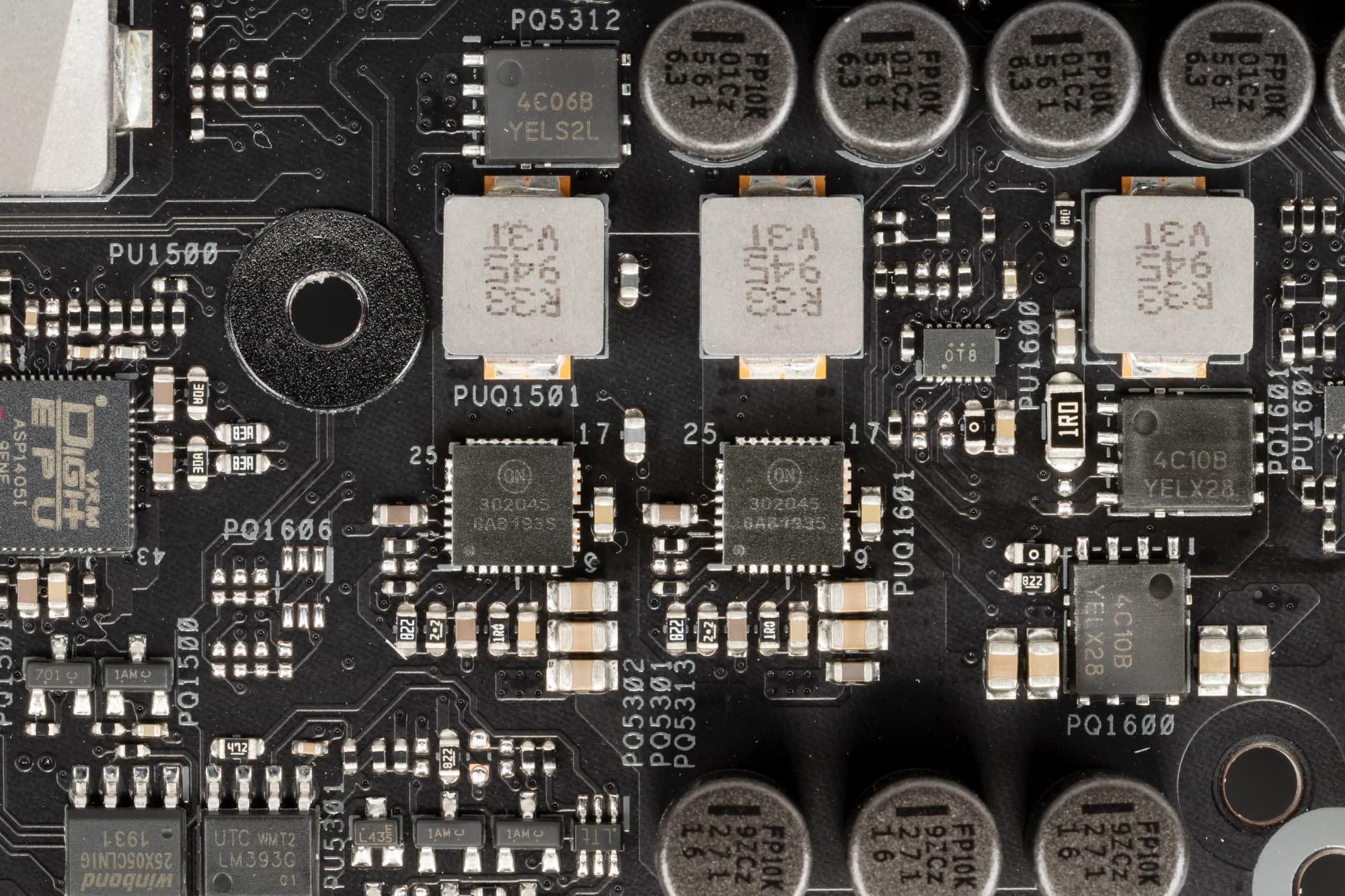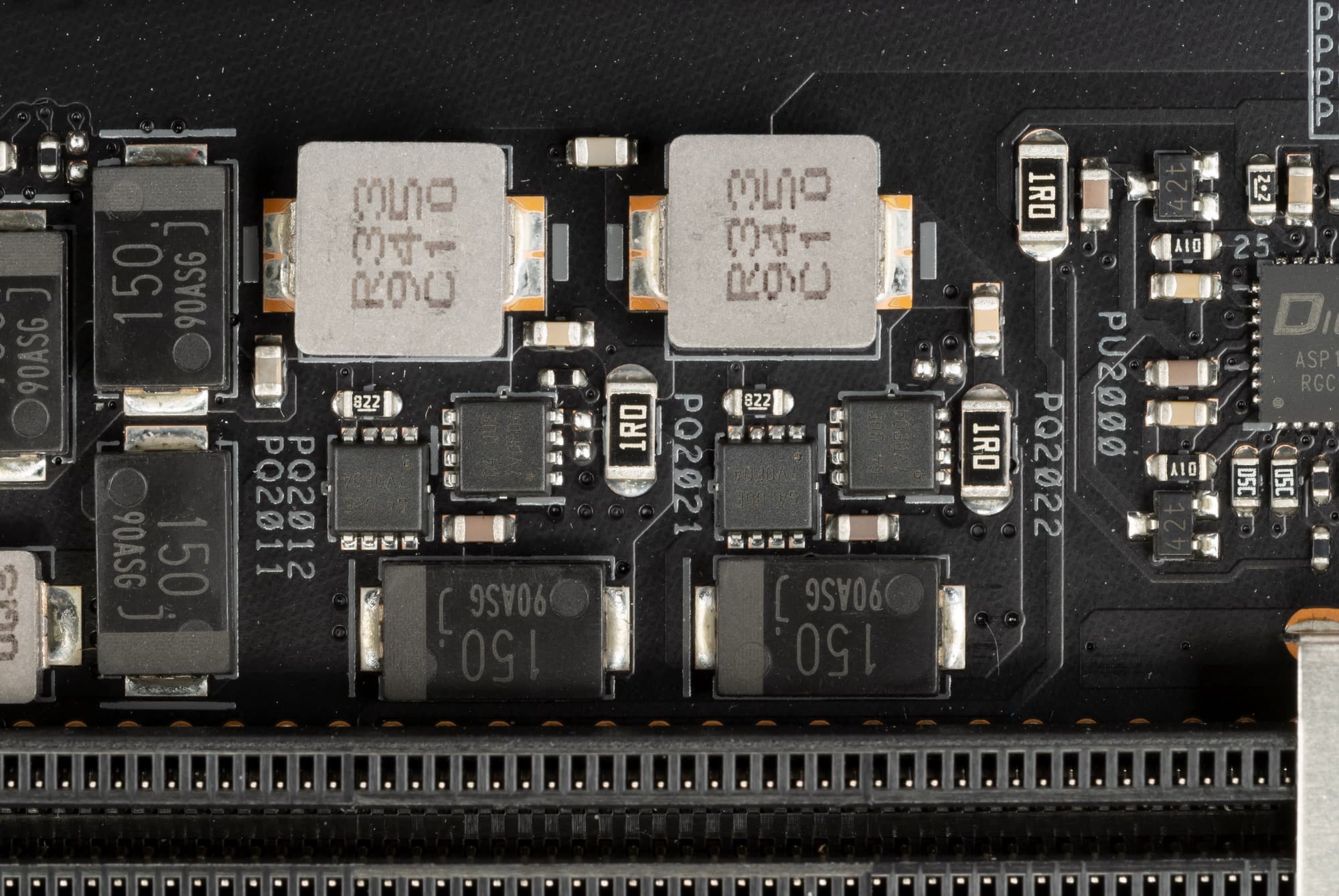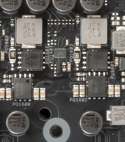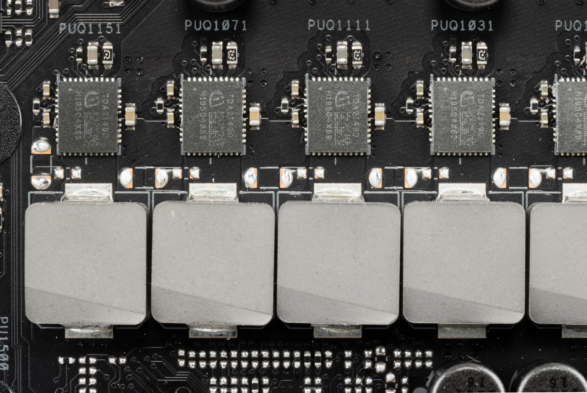 Каждый канал фазы имеет суперферритовую катушку и TDA21490 MOSFET от International Rectifier.