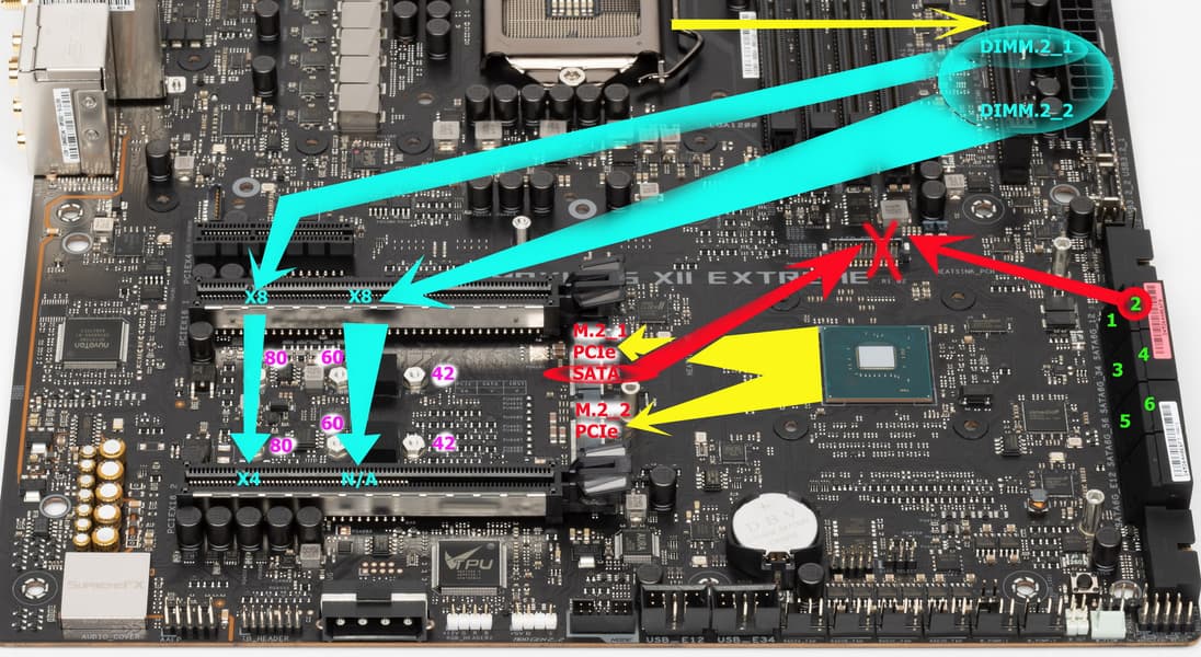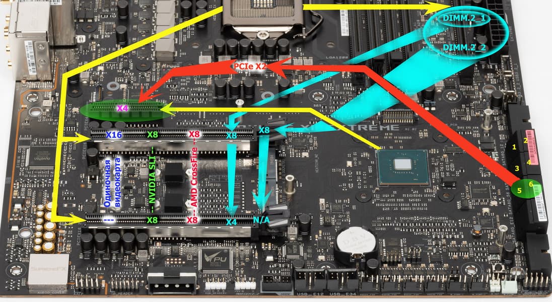 Ниже полная схема распределения ресурсов по слотам PCI-e, ну и с участием DIMM.2
