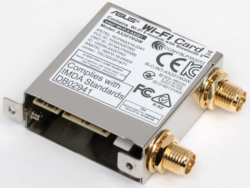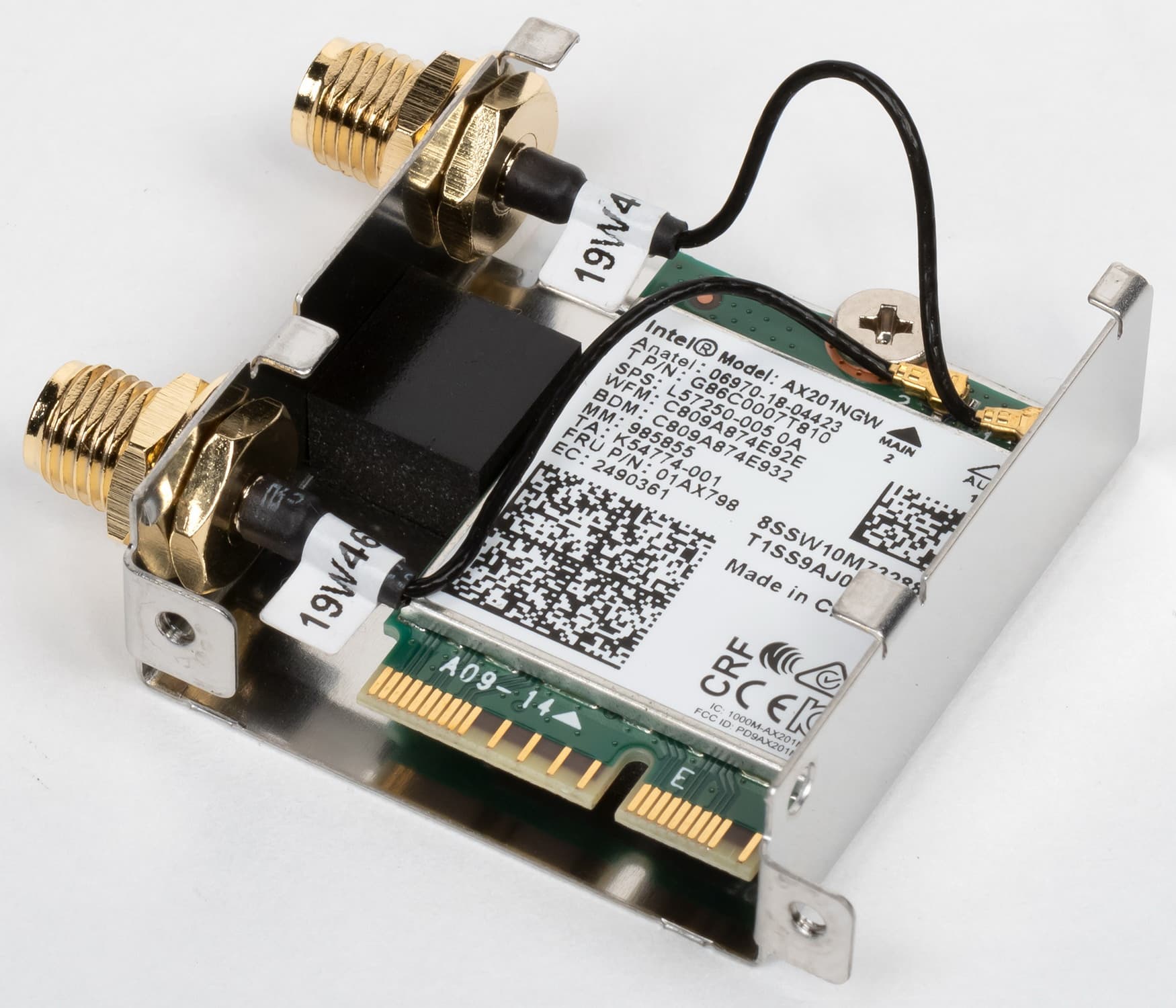 Имеется и комплексный беспроводной адаптер на контроллере Intel AX201NGW, через который реализованы Wi-Fi (802.11a/b/g/n/ac/ax) и Bluetooth 5.0. Он установлен в слот M.2 (E-key), и его разъемы для привинчивания выносных антенн выведены на заднюю панель.
