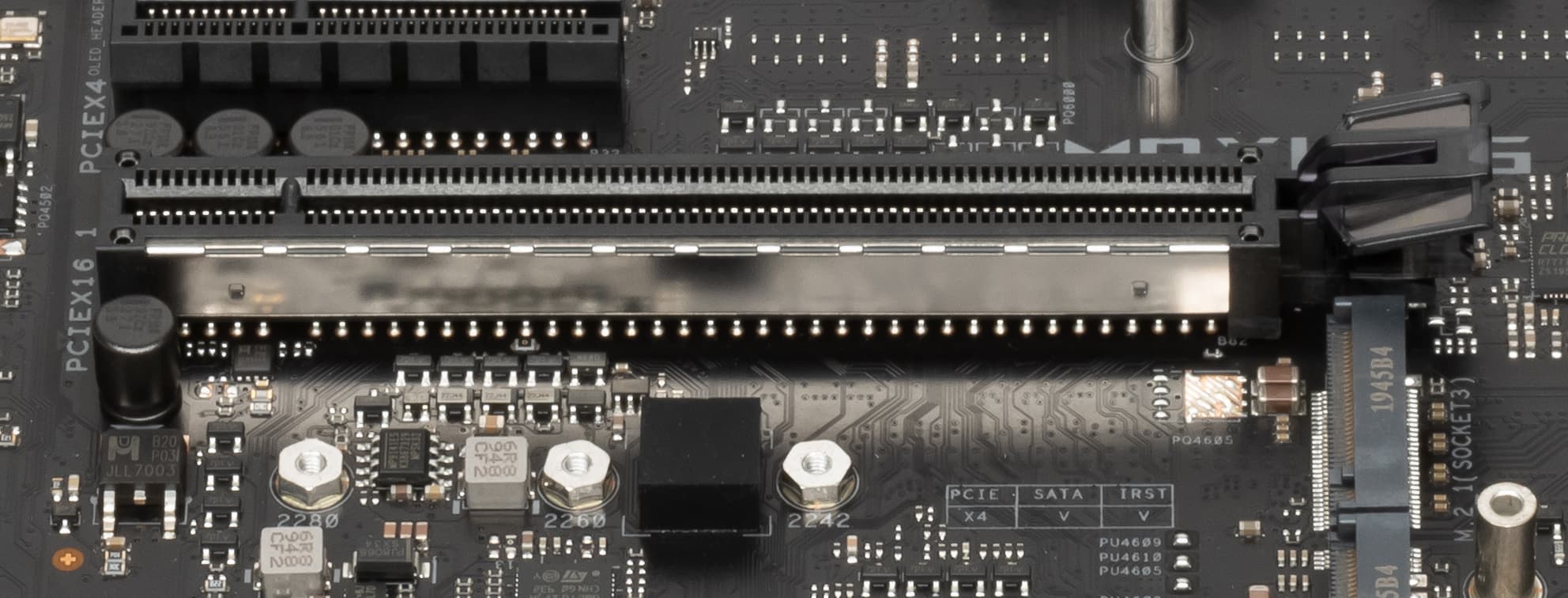 Всего на плате есть 3 слота PCIe: два PCIe x16 (для видеокарт или других устройств) и один «короткий» PCIe x4 (он первый по счету). Если про первые два PCIe x16 я выше уже рассказал (они подключены к CPU), то PCIe x4 подключен к Z490 и делит ресурсы с двумя портами SATA 5 и 6: если какие-либо из последних заняты, то слот работает в режиме PCIe x2, а если SATA 5 и 6 свободны, то слот PCIe x4 получает x4.