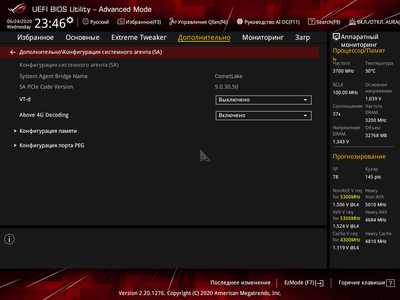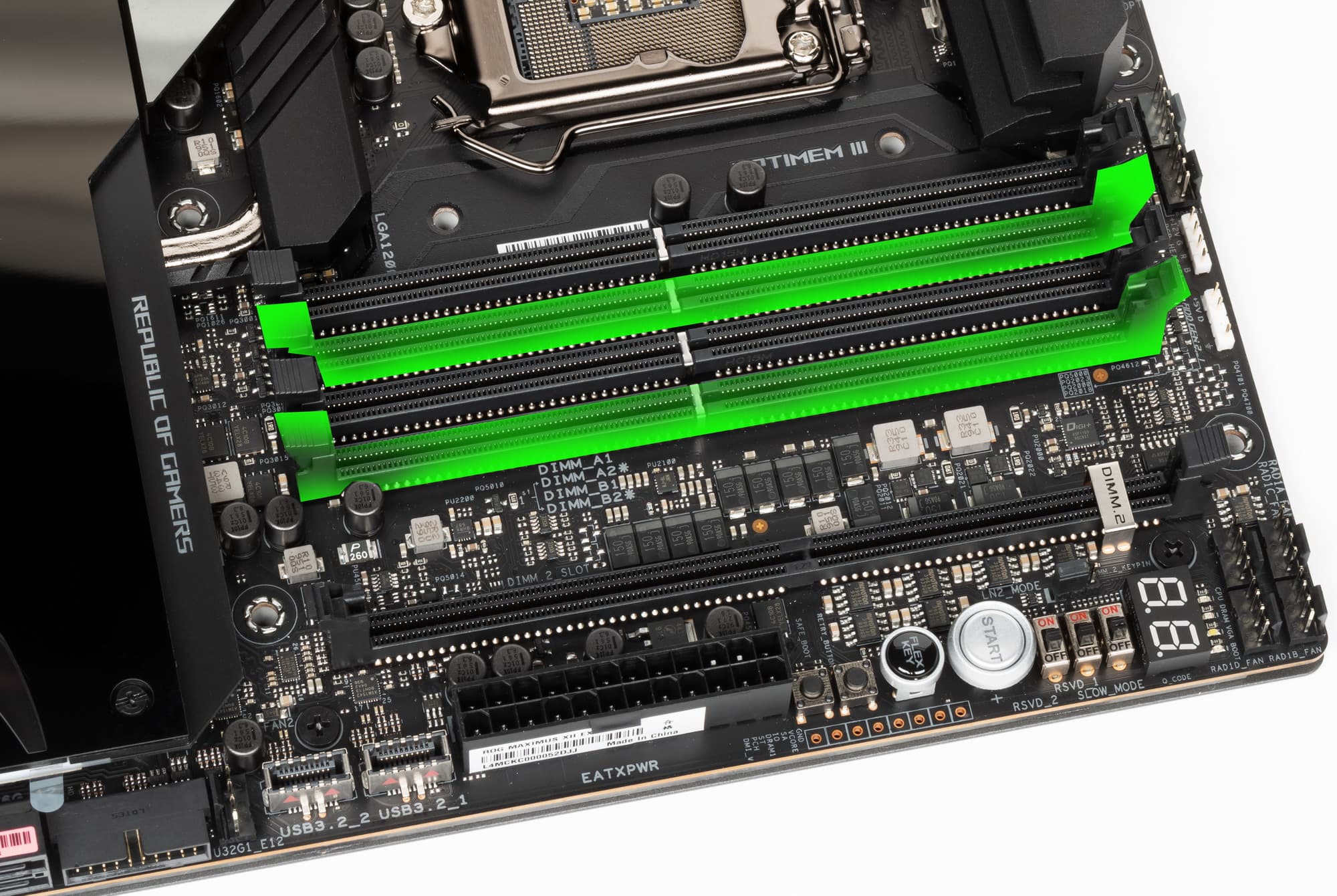 Для установки модулей памяти на плате ROG имеется четыре DIMM-слота (для работы памяти в Dual Channel в случае использования всего 2 модулей их следует устанавливать в А2 и B2. Плата поддерживает небуферизованную память DDR4 (non-EСС), а максимальный объем памяти составляет 128 ГБ (при использовании UDIMM последнего поколения по 32 ГБ). Разумеется, поддерживаются профили XMP.