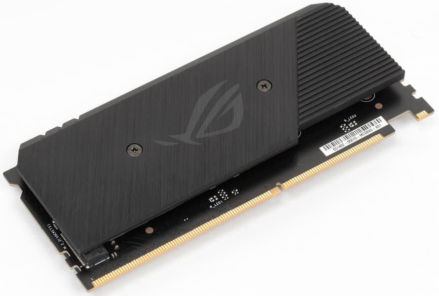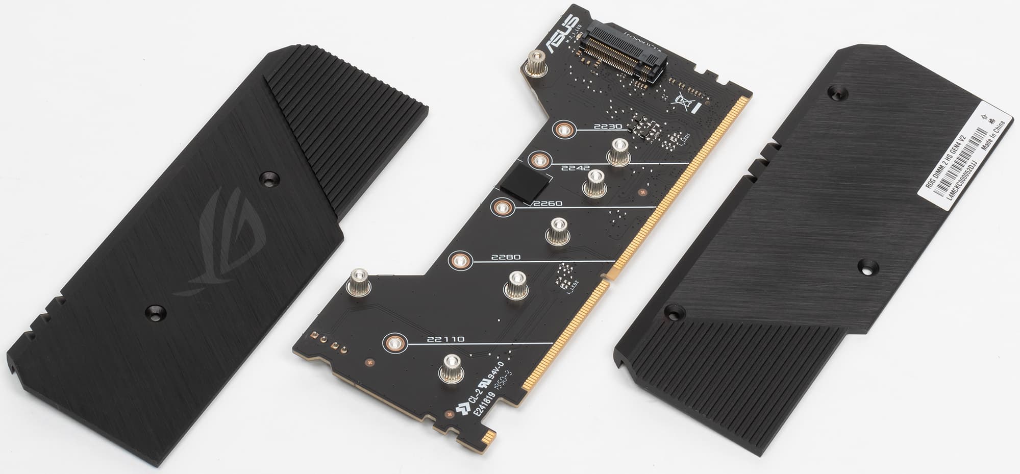 Как уже выше говорил, в комплект поставки входит адаптер DIMM.2, вставляемый в свой особый слот рядом со слотами для ОЗУ. Чтобы пользователь не перепутал слоты, DIMM.2 имеет блокиратор. Адаптер DIMM.2, несущий на себе по одному слоту M.2 с каждой стороны, имеет собственные радиаторы охлаждения.