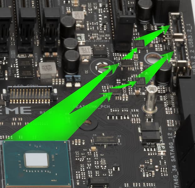 Плюс 22 линии PCIe, выделенные на поддержку иной периферии (включая те же самые контроллеры USB). Итого у Z490 реализовано 30 высокоскоростных портов из 30.