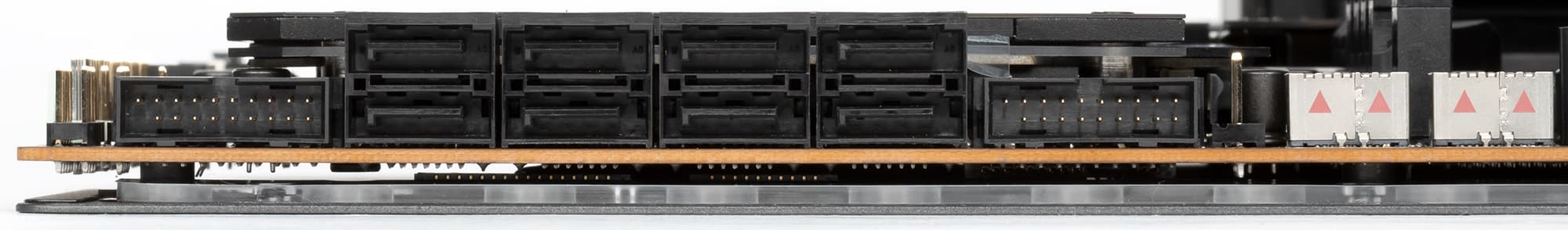 Всего у платы 8 разъемов Serial ATA 6 Гбит/с + 2 слота для накопителей в форм-факторе M.2. (Еще один слот M.2, спрятанный под кожухом блока разъемов задней панели, занят контроллером беспроводных сетей Wi-Fi/Bluetooth.). 6 портов SATA реализованы через чипсет Z490 и поддерживают создание RAID. Еще два порта SATA реализованы через контроллер ASMedia ASM1061 (на него ушла 1 PCI-e линия от Z490).