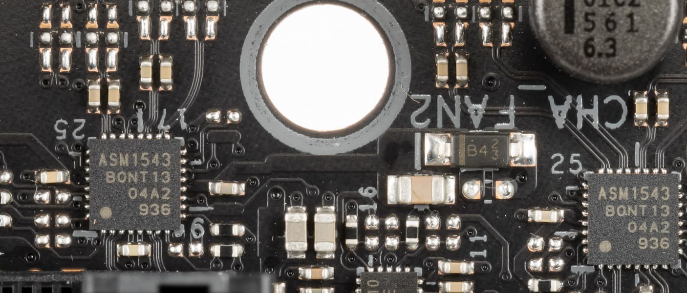 Все быстрые USB порты Type-A/Type-C оснащены ре-драйверами ASM1543 от ASMedia, дающими устойчивый вольтаж, способный обеспечить быструю зарядку мобильных гаджетов через них.