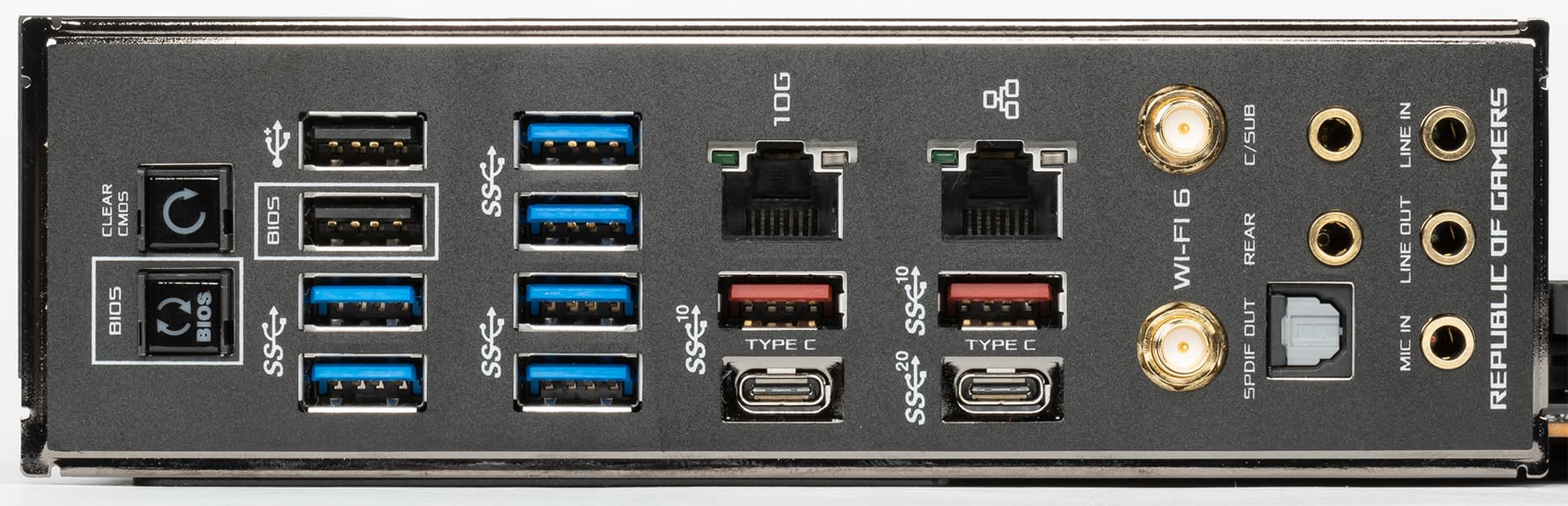 | Разъемы на задней панели | 1 × USB 3.2 Gen2x2 (Type-C) 1 × USB 3.2 Gen2 (Type-C) 2 × USB 3.2 Gen2 (Type-A) 6 × USB 3.2 Gen1 (Type-A) 2 × USB 2.0 (Type-A) 2 × RJ-45 5 аудиоразъемов типа миниджек 1 × S/PDIF (оптический, выход) 2 антенных разъема кнопка сброса CMOS кнопка перепрошивки BIOS — Flashback |