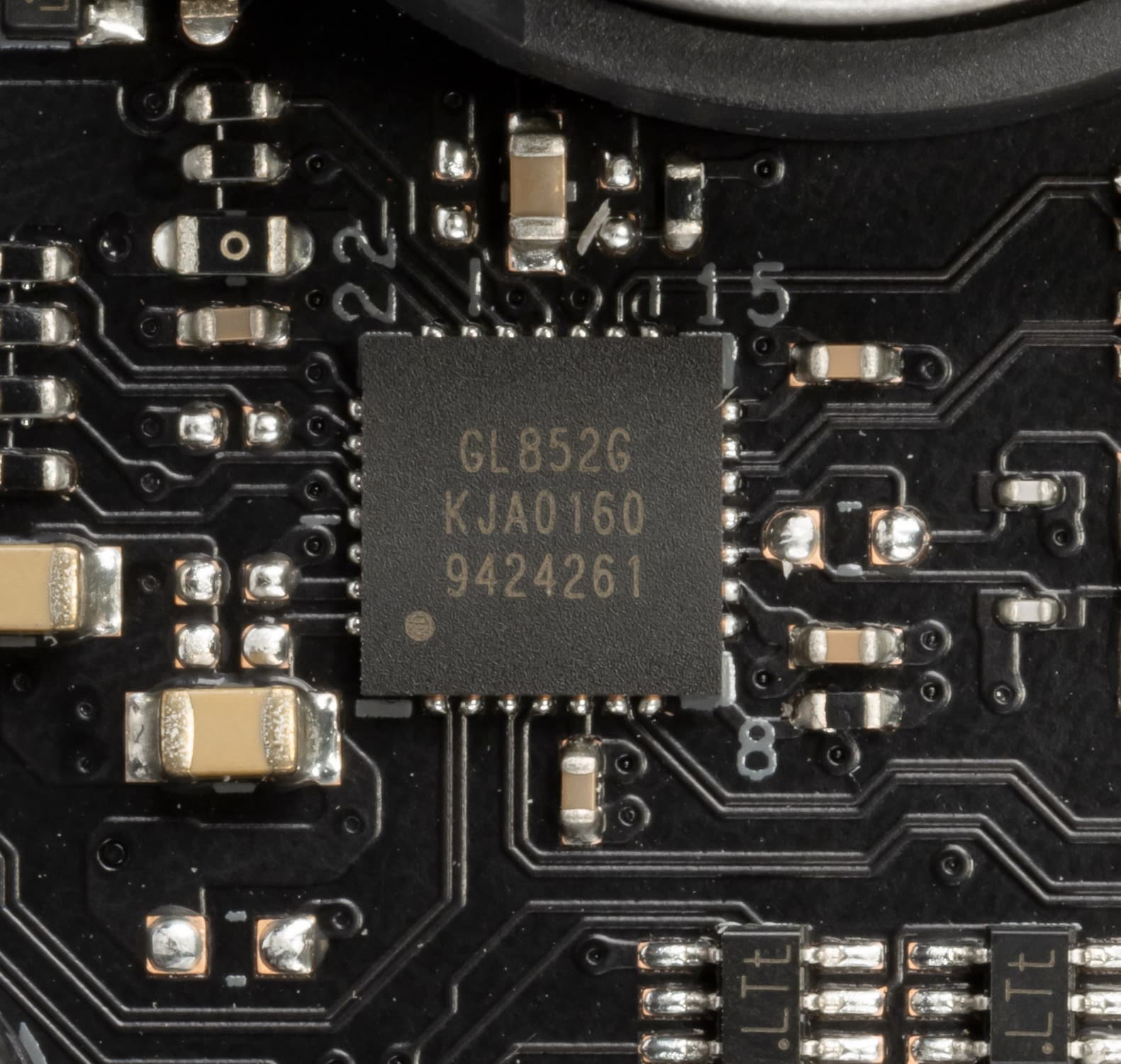 Два контроллера ASMedia ASM1074 (4 USB 3.2 Gen1 (Type-A на задней панели) и 4 USB 3.2 Gen1 (2 внутренних разъема на 4 порта)) используют сигнальные линии портов USB 3.1 Gen1 от Z490, а контроллер Genesys Logic GL852G (4 USB 2.0 на 2х внутренних разъемах) использует линию порта USB 2.0. Подробнее в разделе по USB-портам.
