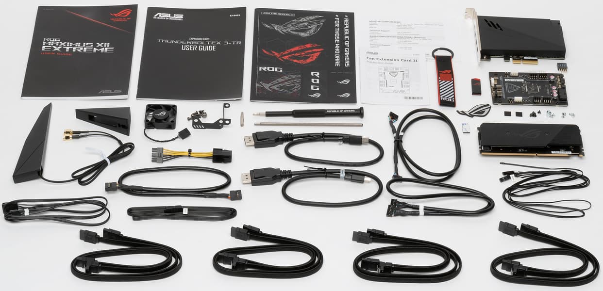 Комплект поставки просто шикарен! Кроме традиционных элементов типа руководства пользователя и кабелей SATA (что уже много лет является обязательным набором ко всем материнкам), имеются: выносная антенна с подставкой для беспроводных соединений, разветвители для подключения подсветок, винтики для монтажа модулей M.2, фирменный адаптер Q-Connector, дополнительный вентилятор VRM с крепежом, накопитель c ПО, плата с дополнительными гнездами вентиляторов и подсветки Fan Extension Card, Thunderbolt 3 Expansion Card c необходимыми кабелями, адаптер дополнительных слотов M.2 DIMM.2, бонусные стикеры, брелок и наклейки.