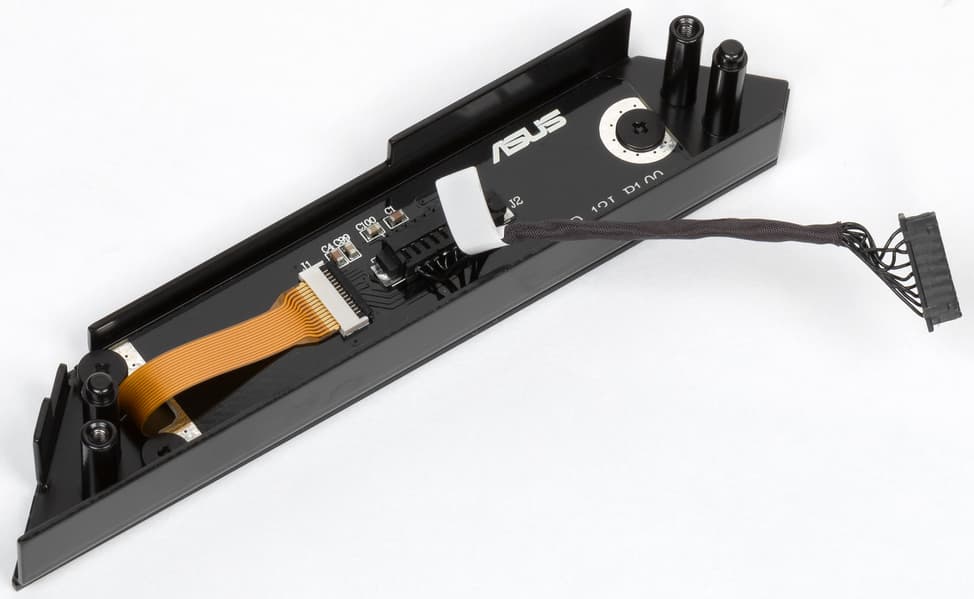 Как мы видим, охлаждение чипсета (один радиатор, прикрытый декоративной пластиковой крышкой с рассеивателем подсветки в виде лого ROG) организовано отдельно от силовых преобразователей.