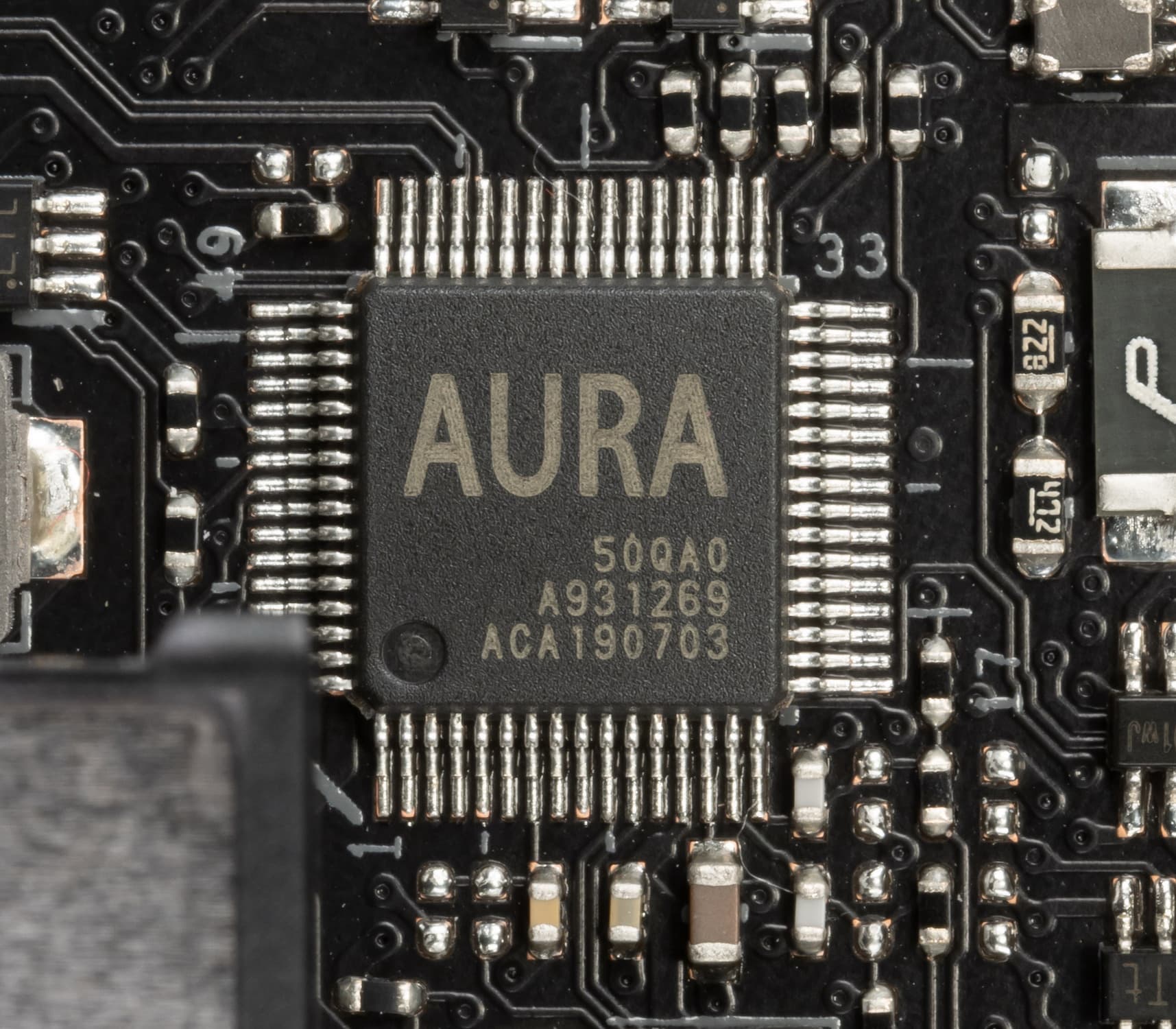 Над аудиоподсистемой установлен кожух соответствующего дизайна (главным образом для крепления радиатора M.2), также мы видим привычный кожух над блоком разъемов задней панели, он оснащен подсветкой.