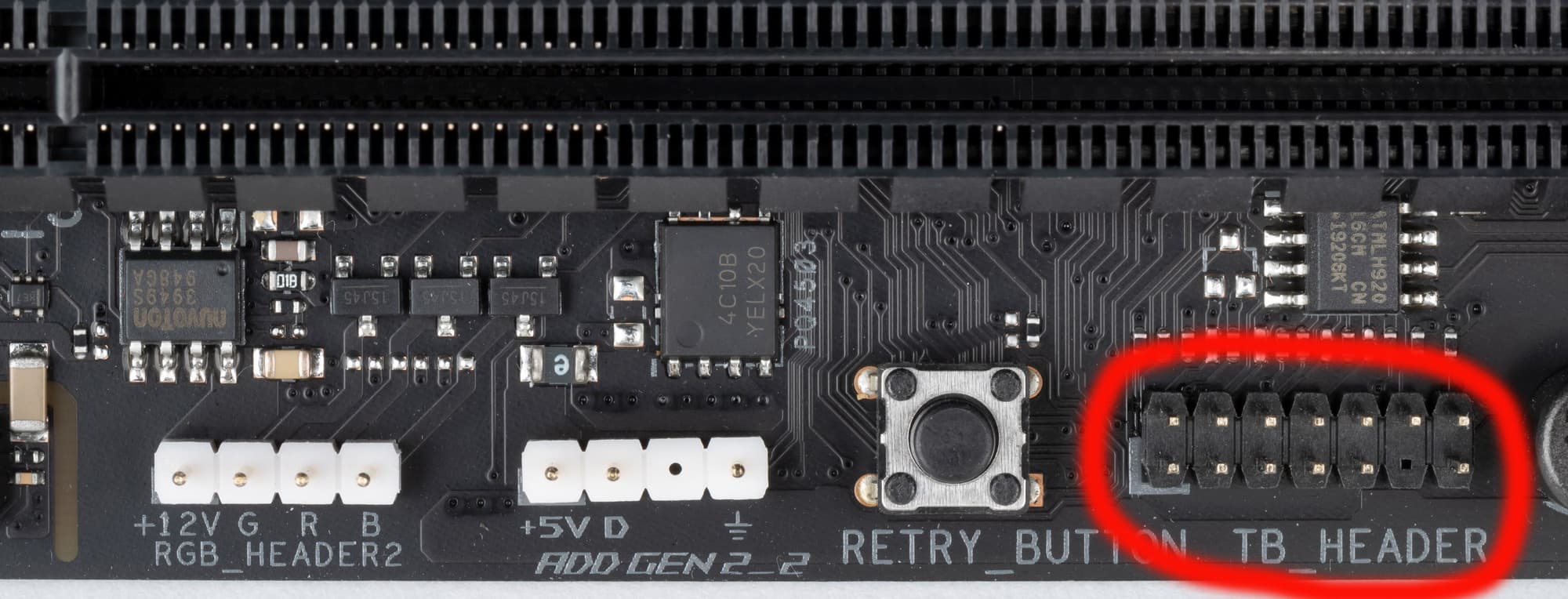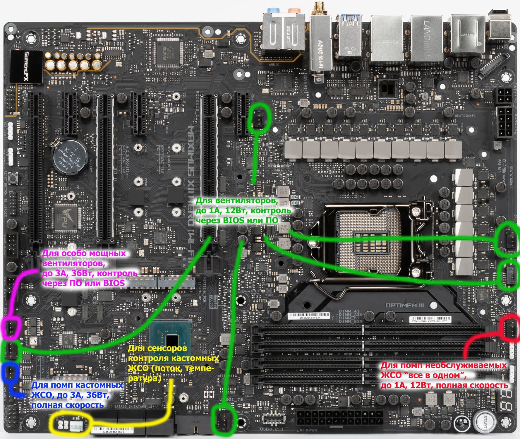 | Прочие внутренние элементы | 24-контактный разъем питания ATX 1 8-контактный разъем питания EPS12V 1 4-контактный разъем питания EPS12V 1 слот M.2 (E-key), занят адаптером беспроводных сетей 1 разъем для подключения порта USB 3.2 Gen2 Type-C 1 разъем для подключения 2 портов USB 3.2 Gen1 2 разъема для подключения 4 портов USB 2.0 8 разъемов для подключения 4-контактных вентиляторов и помп ЖСО 2 разъема для подключения неадресуемой RGB-ленты 2 разъема для подключения адресуемой ARGB-ленты 1 разъем аудио для передней панели корпуса 1 разъем Thunderbolt 1 разъем для термодатчика 2 разъема для подключения управления с передней панели корпуса 1 кнопка Retry 1 кнопка включения питания Power 1 кнопка перезагрузки FlexKey (по умолчанию Reset) |