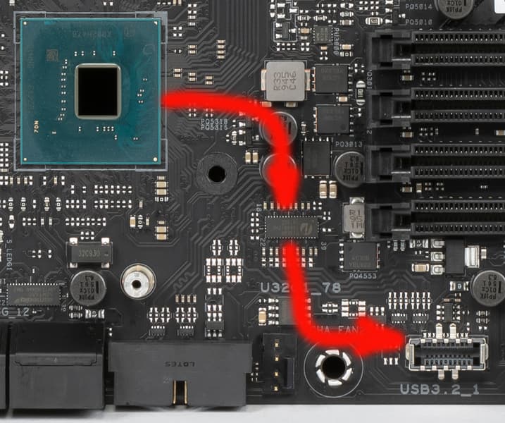 Итак, кроме USB-портов, к которым мы подойдем позже, чипсет Z490 обладает 24 PCIe линиями. Считаем, сколько линий уходит на поддержку (связь) с тем или иным элементом (надо учитывать, что из-за дефицита PCIe линий некоторые элементы периферии делят их, и потому использовать одновременно нельзя: для этих целей у материнской платы существует большое количество мультиплексоров):