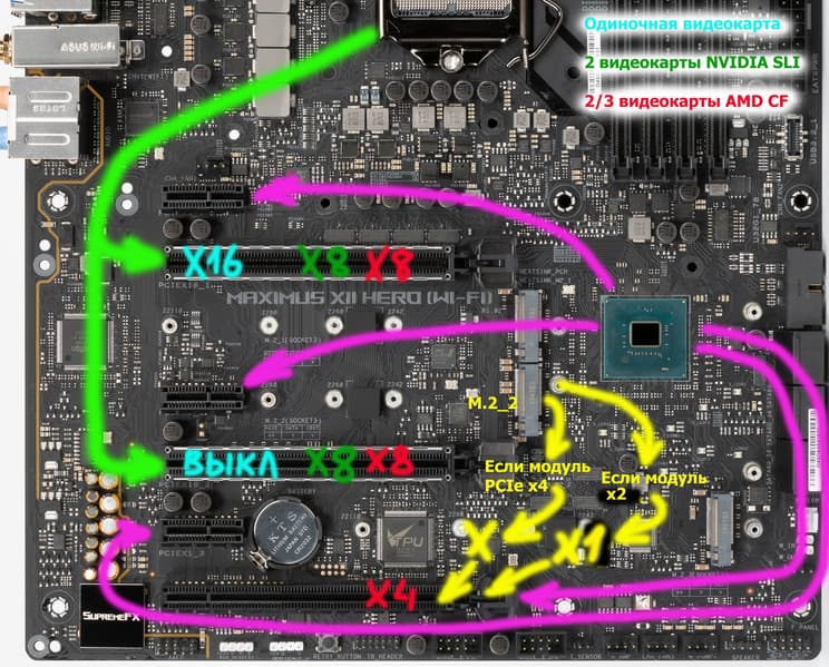 - Переключатель: или слот PCIe x16_3 (4 линии), или слот M.2_2 (4 линии): максимум 4 линии;
