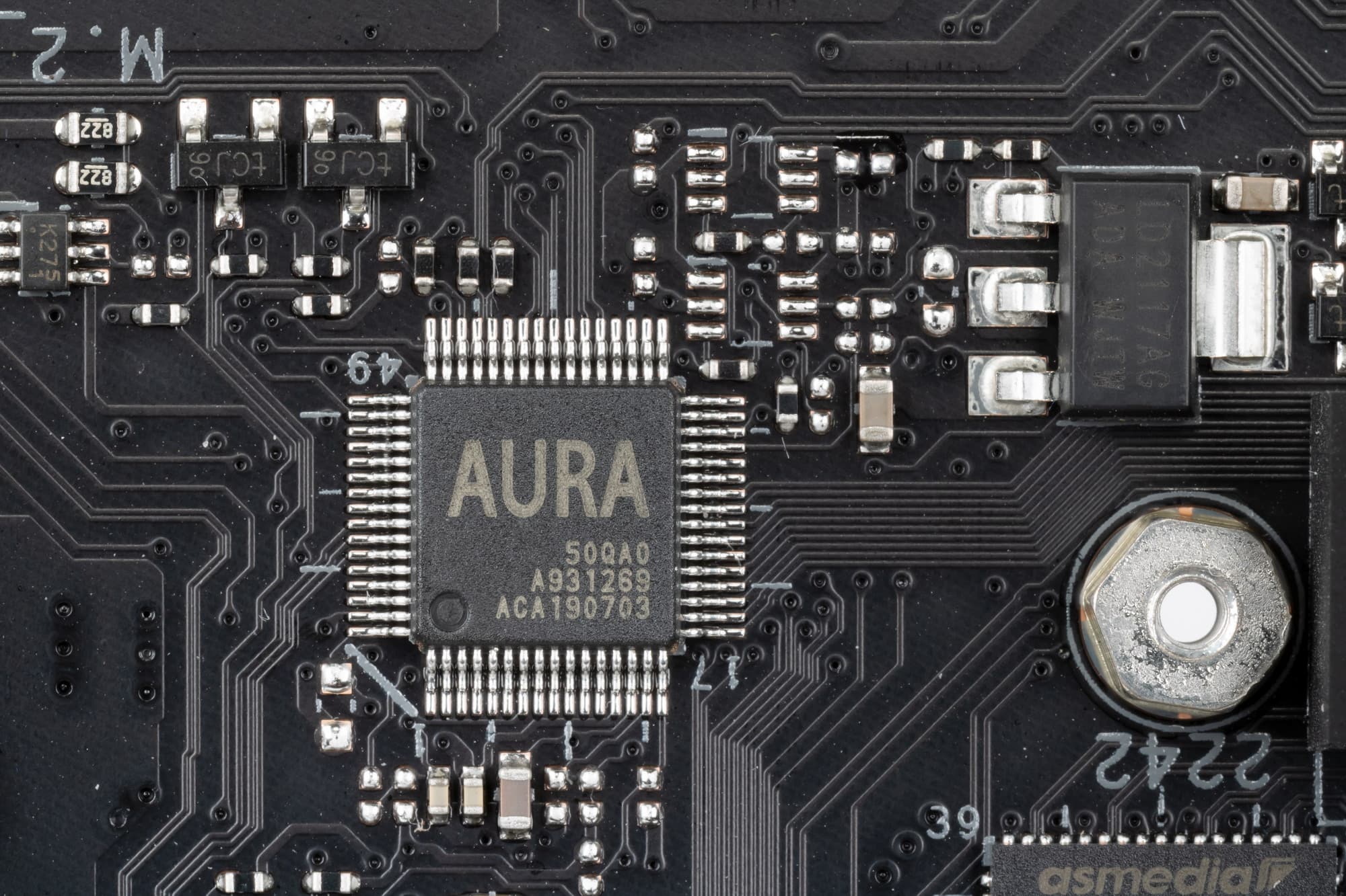 Над аудиоподсистемой установлен пластиковый кожух соответствующего дизайна, также мы видим привычный кожух над блоком разъемов задней панели, он оснащен подсветкой. И напомню, что чипсетный радиатор тоже имеет пластиковый кожух, рассеивающий подсветку из светодиодов, установленных на самой PCB около Z490.