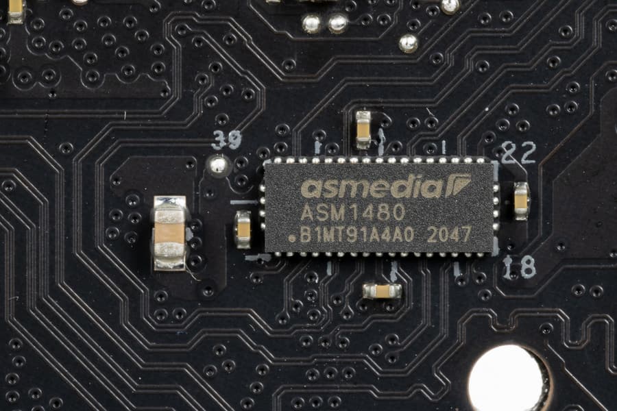 - 4 порта USB 3.2 Gen1: 2 реализованы через контроллер ASMedia ASM1074 (на него потрачена 1 линия PCIe 3.0) и представлены внутренним разъемом на материнской плате на 2 порта; еще 2 реализованы через Z590 и представлены также внутренним разъемом на материнской плате на 2 порта;