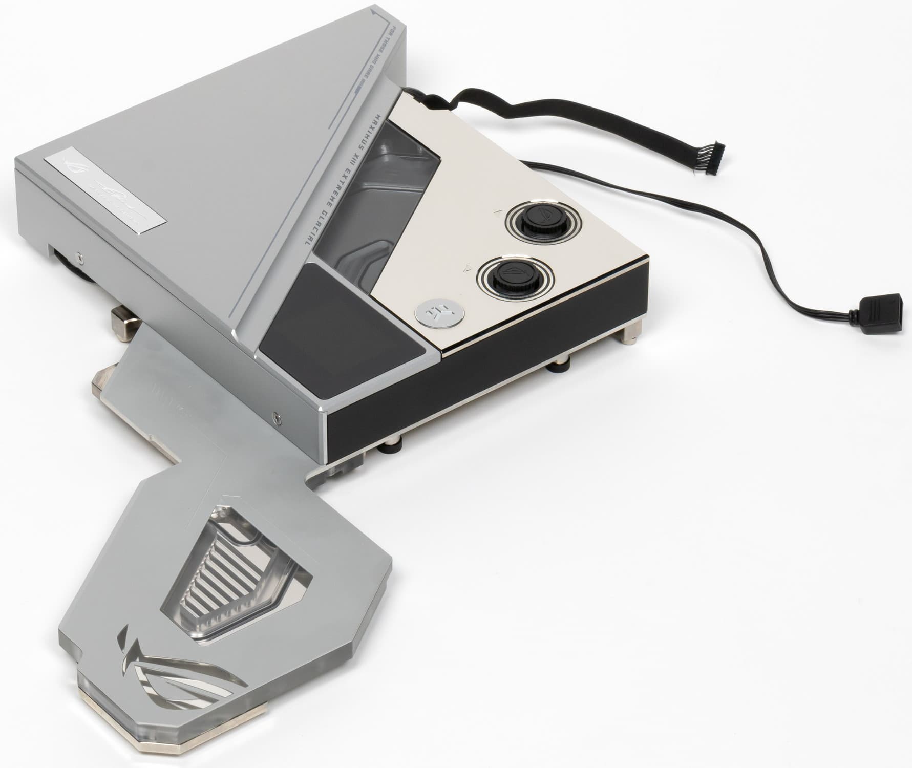 Asus ROG Maximus XIII Extreme Glacial поставляется в огромном кейсе, который имеет ручку для переноски и раскладывается пополам. В одной половине — сама матплата, тщательно уложенная в толстый слой мягкого материала, во второй — водоблок в своем отсеке, ну и остальной комплект.