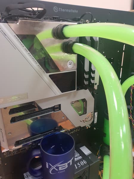 Как я выше уже писал, в комплект поставки с матплатой входит огромный водоблок, предназначенный для охлаждения процессора, преобразователей питания VRM, системного чипсета и 10Gb/s сетевого контроллера от Marvel.