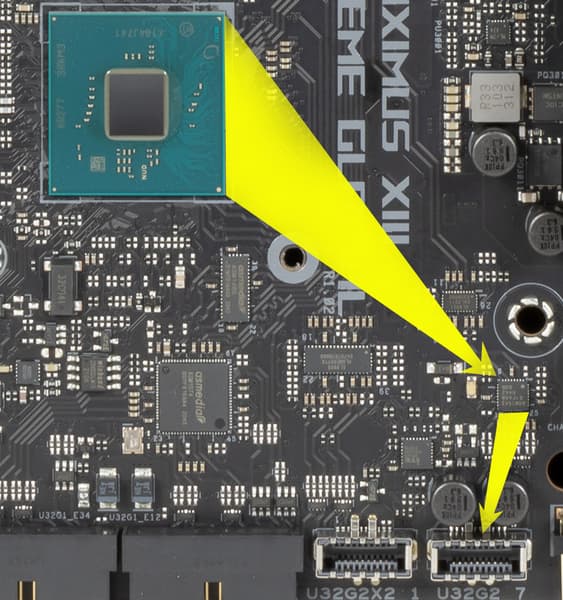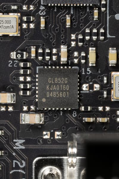 - 1 порт USB 3.2 Gen2x2: реализован с помощью Z590 (на это ушел 1 USB 3.2 Gen2) и двух «помощников»: хаба ITE IT8851 (который образует USB 3.2 Gen1) и усилителя Genesys Logic GL9905 (который преобразует сие в USB 3.2 Gen2) и представлен внутренним портом Type-C (для подключения к соответствующему разъему на передней панели корпуса);