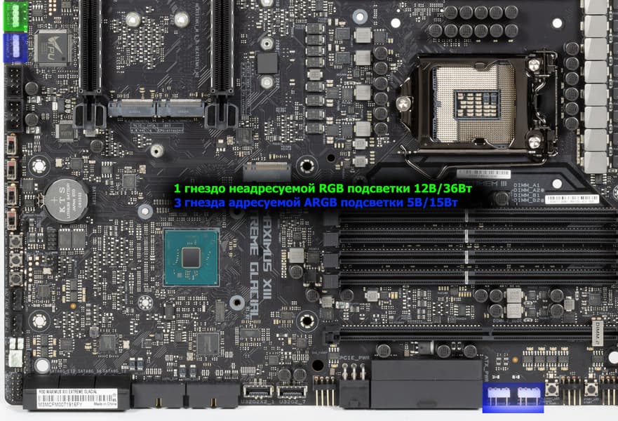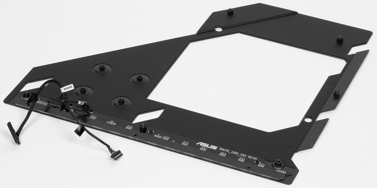 Материнская плата имеет бэкплейт с оборотной стороны, который не только защищает PCB от повреждений, но и несет элементы подсветки.