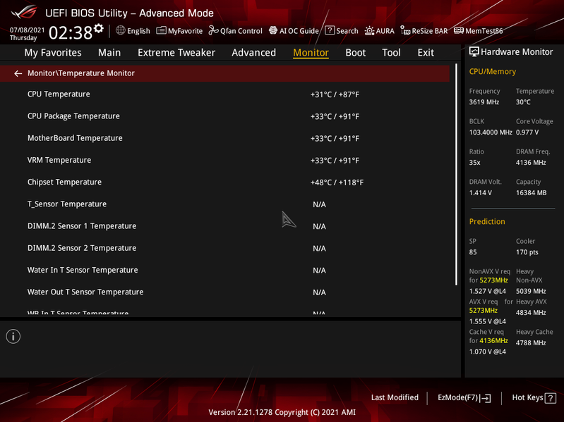 Еще при изучении настроек в BIOS можно найти некий предустановленный режим работы Asus Optimized, то есть система сама определит по питанию и возможностям охлаждения максимально возможные частоты работы. При ее выборе изначально выставляется 5.2 ГГц по всем ядрам, однако уже нет четкой синхронизации частот между ядрами. Разумеется при запуске стресс-тестов нагрев процессора моментально достиг почти критических отметок в 98 градусов, однако троттлинг допущен не был, система сама стала понижать частоты по ядрам (разбег от 4,2 до 5,1 ГГц), балансируя на максимуме возможного нагрева в 90-93 градуса. В целом оказалось, что производительность в этом режиме на пару процентов выше (в среднем) чем в предыдущем, ну кроме разве что Adobe Premiere, где производительность в Asus Optimized выше на 3.2% чем в режиме по умолчанию.