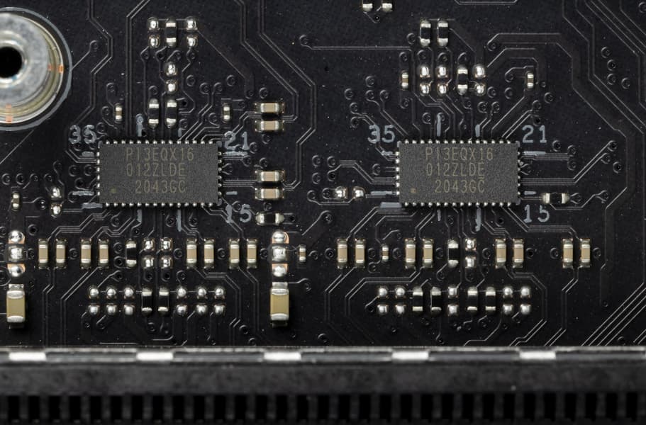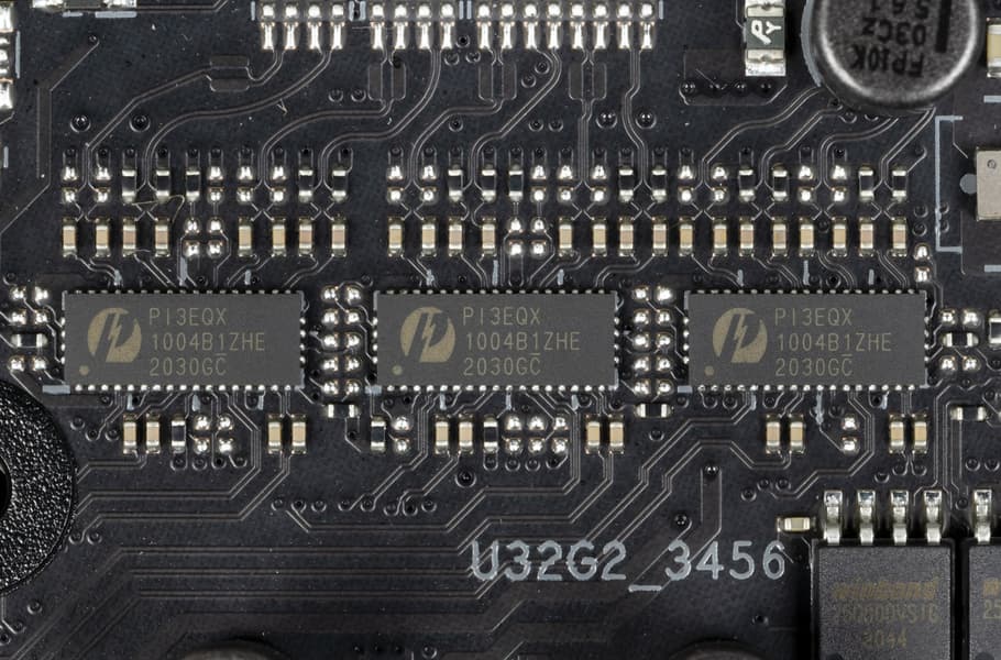 Как видим, перераспределение линий PCIe между слотами у этой материнки имеется, поэтому востребованы мультиплексоры PI3EQX16 от Diodes Inc. (ex Pericom).