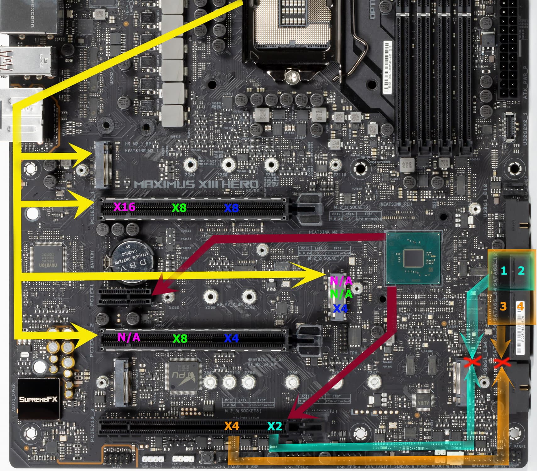 - Переключатель: или порты SATA_1/2 + слот PCIe x16_3 в режиме x2 (4 линии), или слот PCIe x16_3 в режиме x4 (4 линии), или порты SATA_1/2/3/4: максимум 4 линии;
