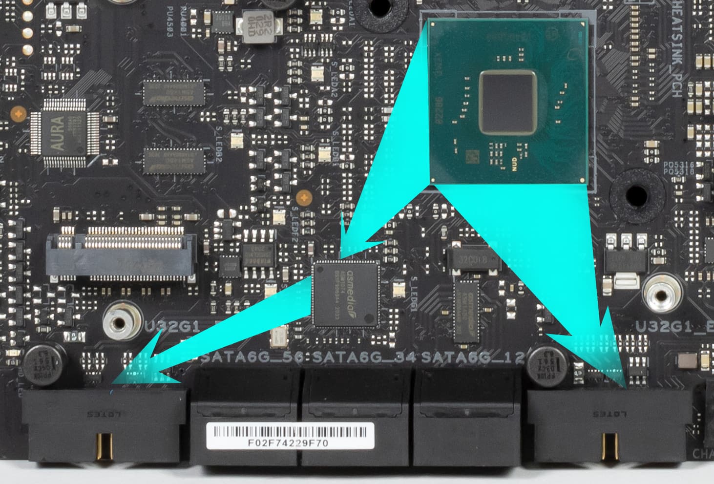 4 порта SATA_1/2/3/4 делят ресурсы со слотом PCIe x16_3, выше я уже рассказал про это. А 2 порта SATA_5/6 делят ресурсы с одним из М.2, о чем пойдет речь ниже.