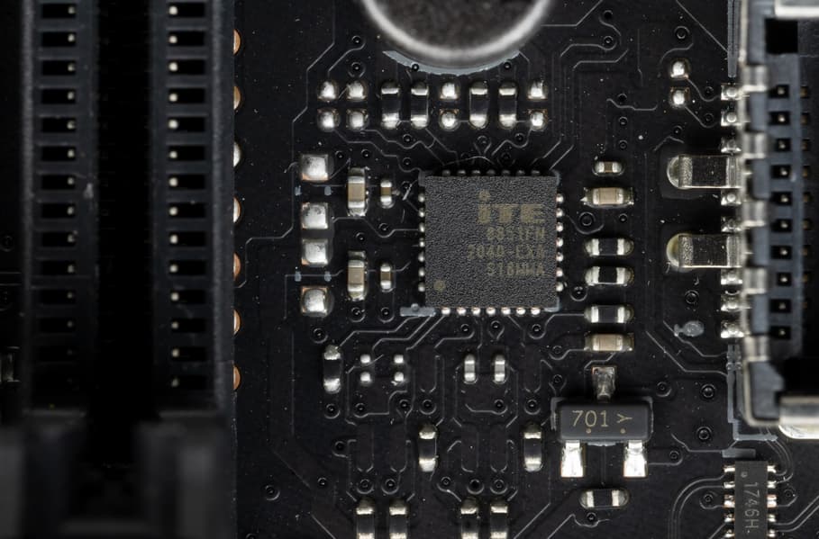- 1 порт USB 3.2 Gen2x2: реализован с помощью Z590 (на это ушел 1 USB 3.2 Gen2) и двух «помощников»: хаба ITE IT8851 (который образует USB 3.2 Gen1) и усилителя Genesys Logic GL9905 (который преобразует сие в USB 3.2 Gen2) и представлен внутренним портом Type-C (для подключения к соответствующему разъему на передней панели корпуса);
