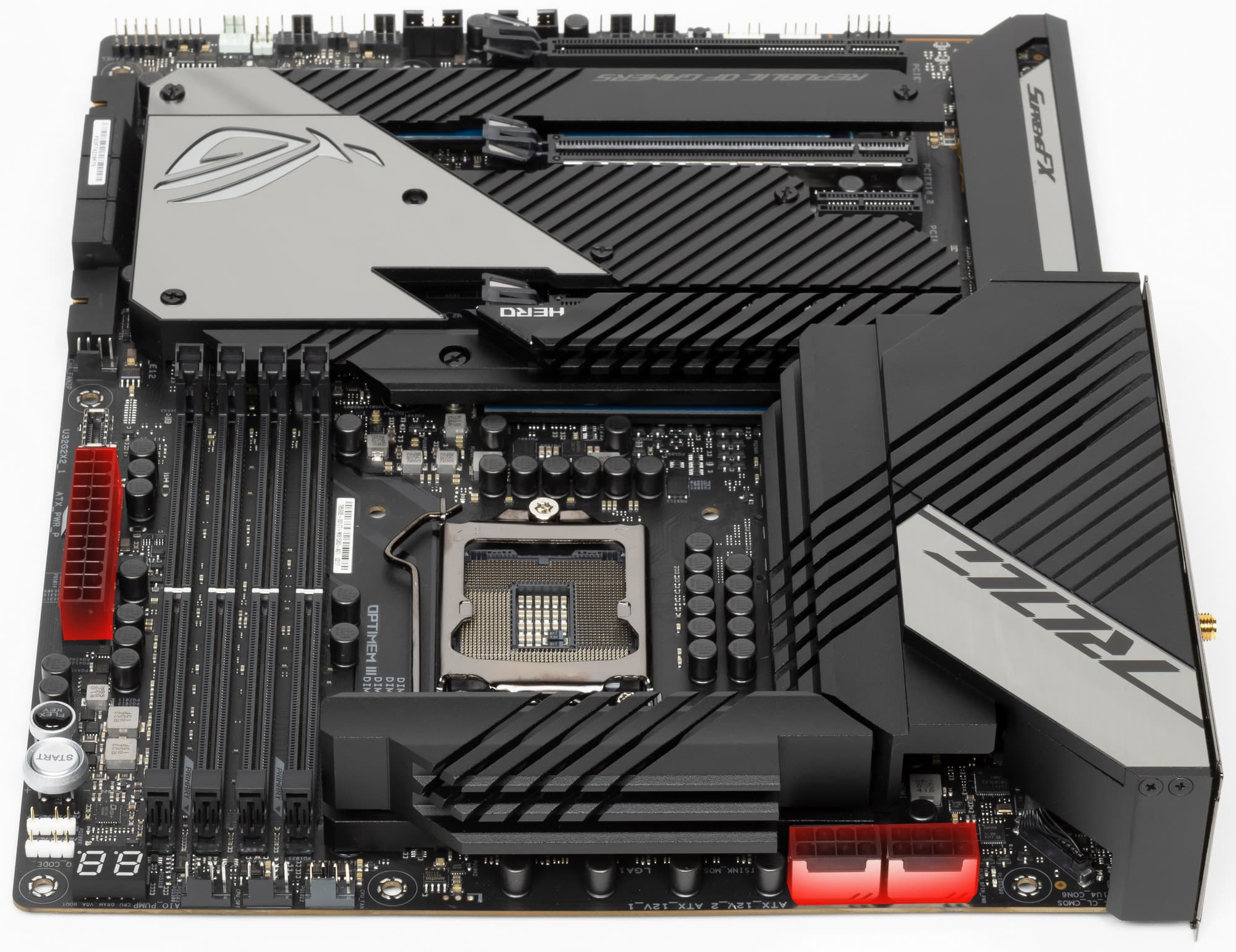 Возвращаюсь к самой материнской плате, которая относится к топовому суббренду ROG, поэтому перед нами почти флагман (мы помним, что самая-самая в этой линейке — материнка c суффиксом Extreme, а Hero — на ступень ниже).