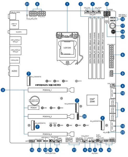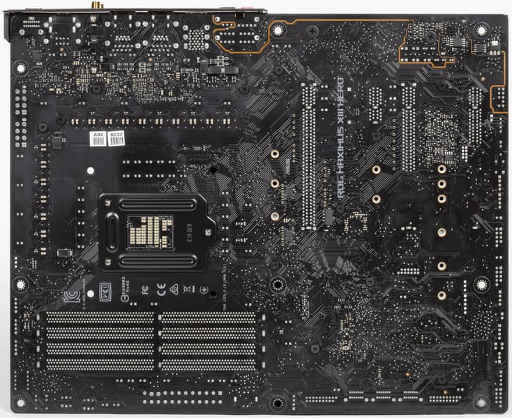 Форм-фактор ATX имеет размеры до 305×244 мм, а E-ATX — до 305×330 мм. Материнская плата Asus ROG Maximus XIII Hero имеет размеры 305×244 мм, поэтому выполнена в форм-факторе ATX, и на ней имеются 9 монтажных отверстий для установки в корпус. Однако следует иметь в виду, что одно из девяти монтажных отверстий перекрыто радиатором для слота M.2.