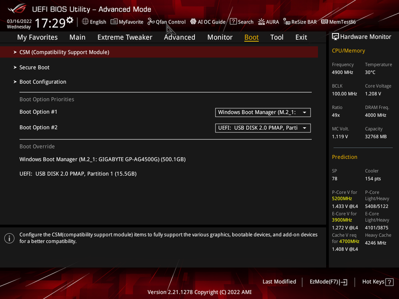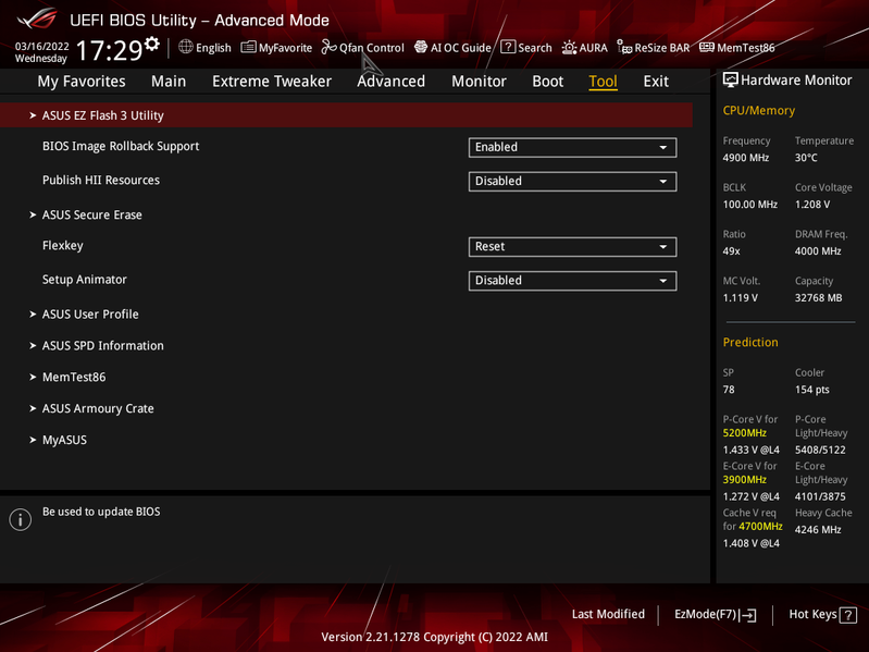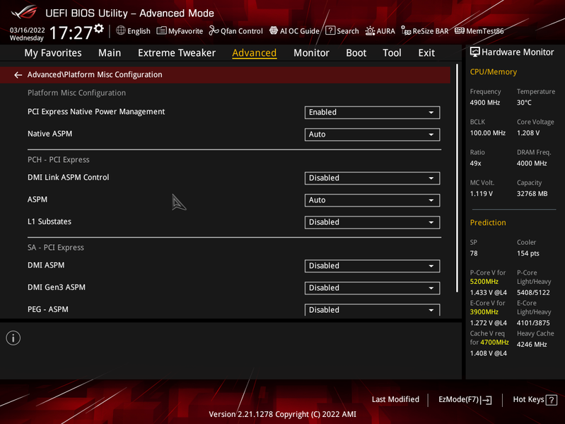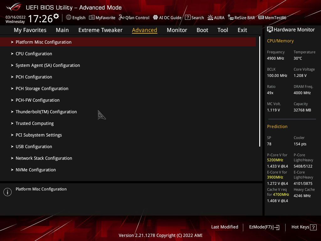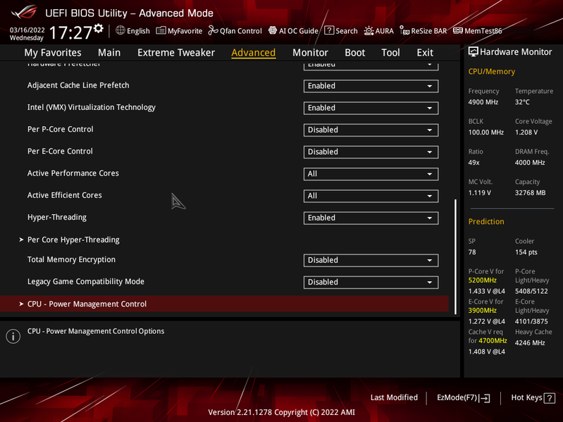 Это как бы для нас уже не ново: видимо так заложено во всех топовых матплатах Asus, что по умолчанию (при активной технологии MCE) автоматически выставляется 4.9 ГГц по всем P-ядрам, и 3.7 ГГц по всем Е-ядрам. Стоит напомнить, что Р-ядра — это обычные всем привычные ядра, имеющие по 2 потока каждый, «Р» — означает Performance, то есть производительные. «Е» — это энергоэффективные ядра, так называемые, малые ядра, у них по 1 потоку. В целом очевидно, что даже без вмешательства пользователя в виде ручного оверклокинга задается весьма высокая планка работы процессора по частотам.